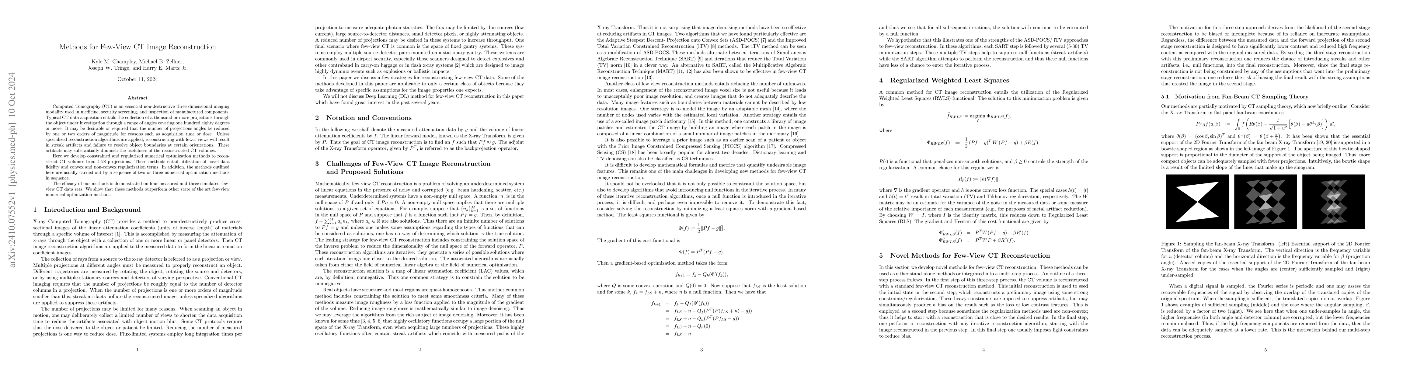 Computed Tomography (CT) is an essential non-destructive three dimensional imaging modality used in medicine, security screening, and inspection of manufactured components. Typical CT data acquisition entails the collection of a thousand or more projections through the object under investigation through a range of angles covering one hundred eighty degrees or more. It may be desirable or required that the number of projections angles be reduced by one or two orders of magnitude for reasons such as acquisition time or dose. Unless specialized reconstruction algorithms are applied, reconstructing with fewer views will result in streak artifacts and failure to resolve object boundaries at certain orientations. These artifacts may substantially diminish the usefulness of the reconstructed CT volumes. Here we develop constrained and regularized numerical optimization methods to reconstruct CT volumes from 4-28 projections. These methods entail utilization of novel data fidelity and convex and non-convex regularization terms. In addition, the methods outlined here are usually carried out by a sequence of two or three numerical optimization methods in sequence. The efficacy of our methods is demonstrated on four measured and three simulated few-view CT data sets. We show that these methods outperform other state of the art few-view numerical optimization methods.