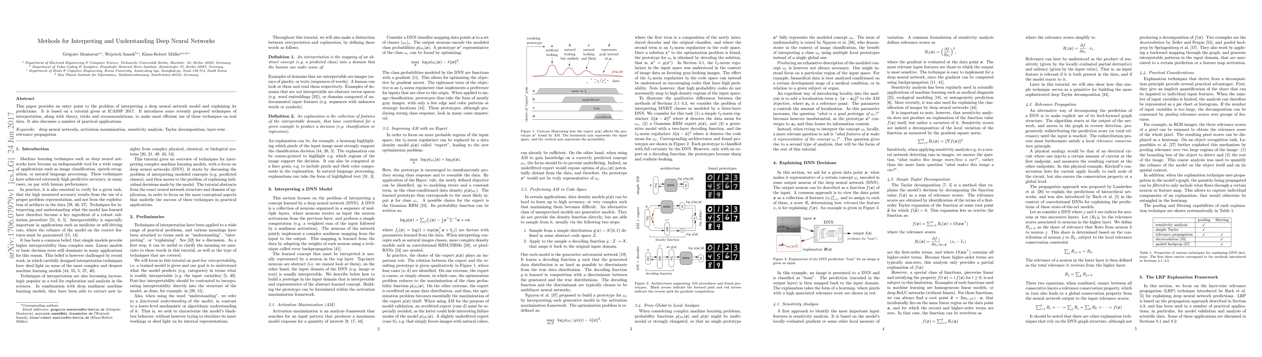 This paper provides an entry point to the problem of interpreting a deep neural network model and explaining its predictions. It is based on a tutorial given at ICASSP 2017. It introduces some recently proposed techniques of interpretation, along with theory, tricks and recommendations, to make most efficient use of these techniques on real data. It also discusses a number of practical applications.