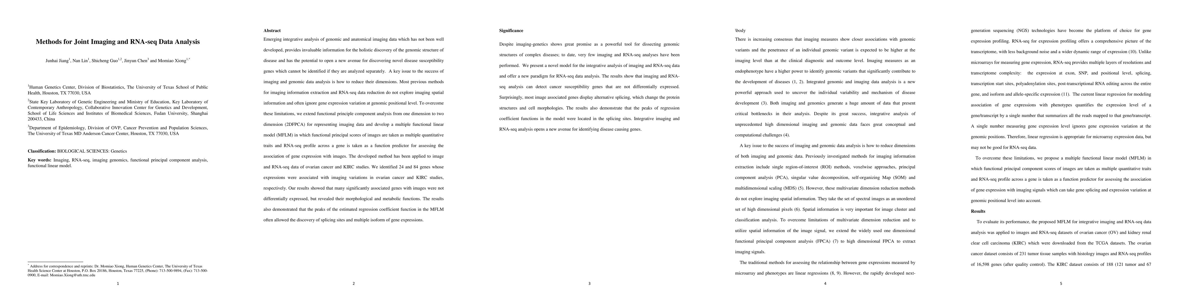 This paper introduces novel methods for integrating imaging and RNA-seq data analysis, specifically extending functional principal component analysis to two dimensions and developing a multiple functional linear model to assess gene expression associations with imaging variations. The method identified numerous genes linked to imaging variations in ovarian cancer and KIRC studies, revealing morphological and metabolic functions and discovering splicing sites and gene isoforms.