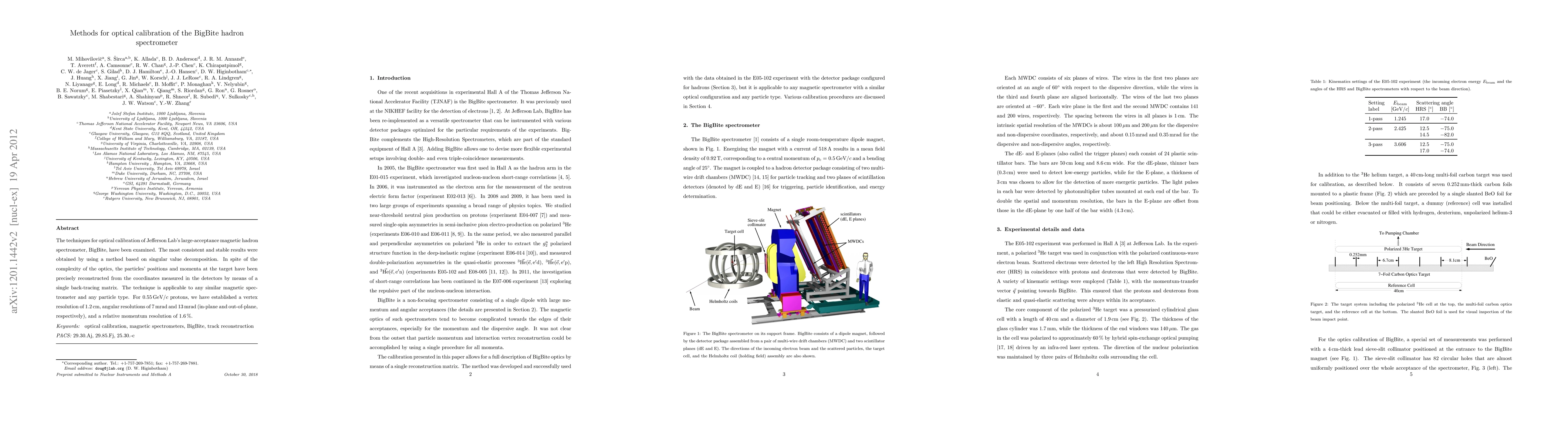 This paper details a method for optical calibration of the BigBite hadron spectrometer using singular value decomposition, achieving precise reconstruction of particle positions and momenta. The technique, applicable to similar spectrometers, provides resolutions of 1.2 cm for vertices, 7 mrad for in-plane angles, and 16 mrad for out-of-plane angles.
