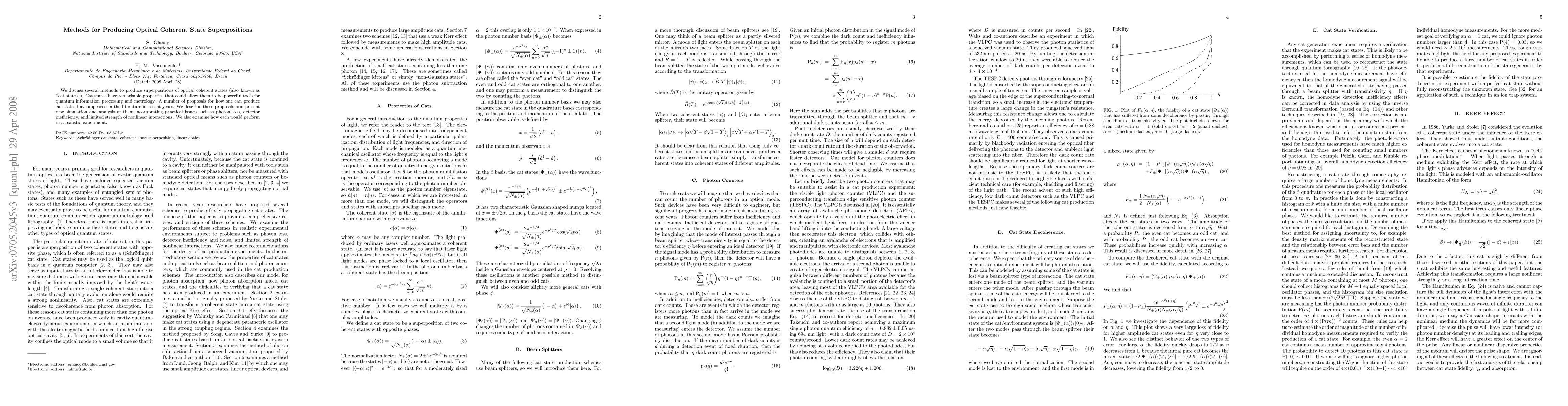 We discuss several methods to produce superpositions of optical coherent states (also known as "cat states"). Cat states have remarkable properties that could allow them to be powerful tools for quantum information processing and metrology. A number of proposals for how one can produce cat states have appeared in the literature in recent years. We describe these proposals and present new simulation and analysis of them incorporating practical issues such as photon loss, detector inefficiency, and limited strength of nonlinear interactions. We also examine how each would perform in a realistic experiment.