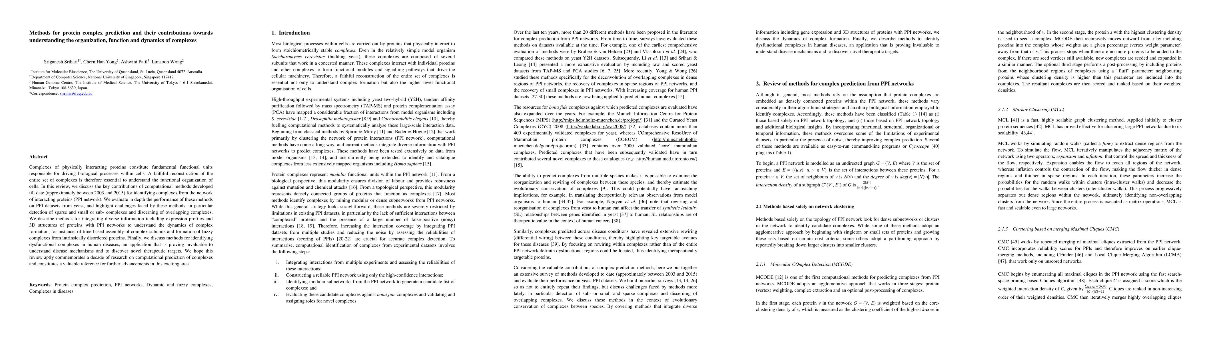 This review surveys computational methods developed from 2003 to 2015 for predicting protein complexes, evaluating their performance on yeast PPI networks and addressing challenges in detecting sparse and small complexes. It also highlights advancements in integrating diverse data to understand complex dynamics and identifies dysfunctional complexes in human diseases.