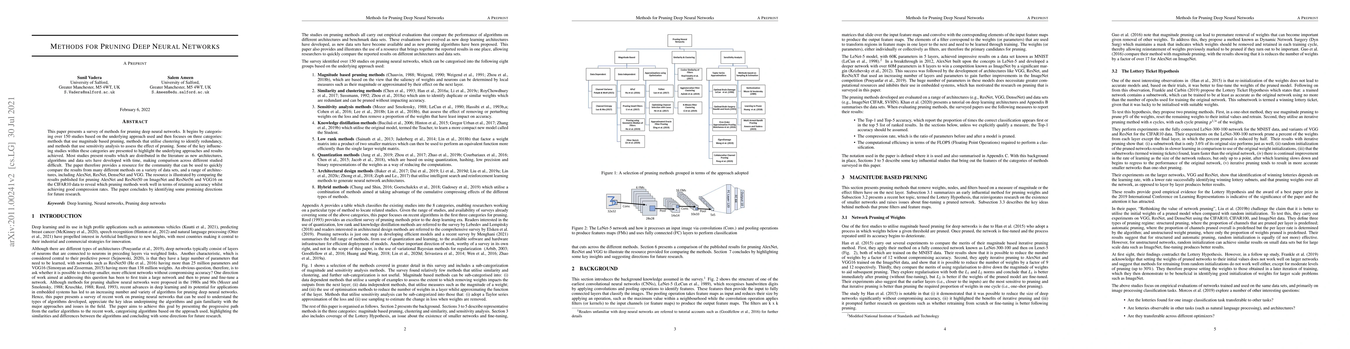 This paper presents a survey of methods for pruning deep neural networks. It begins by categorising over 150 studies based on the underlying approach used and then focuses on three categories: methods that use magnitude based pruning, methods that utilise clustering to identify redundancy, and methods that use sensitivity analysis to assess the effect of pruning. Some of the key influencing studies within these categories are presented to highlight the underlying approaches and results achieved. Most studies present results which are distributed in the literature as new architectures, algorithms and data sets have developed with time, making comparison across different studied difficult. The paper therefore provides a resource for the community that can be used to quickly compare the results from many different methods on a variety of data sets, and a range of architectures, including AlexNet, ResNet, DenseNet and VGG. The resource is illustrated by comparing the results published for pruning AlexNet and ResNet50 on ImageNet and ResNet56 and VGG16 on the CIFAR10 data to reveal which pruning methods work well in terms of retaining accuracy whilst achieving good compression rates. The paper concludes by identifying some promising directions for future research.