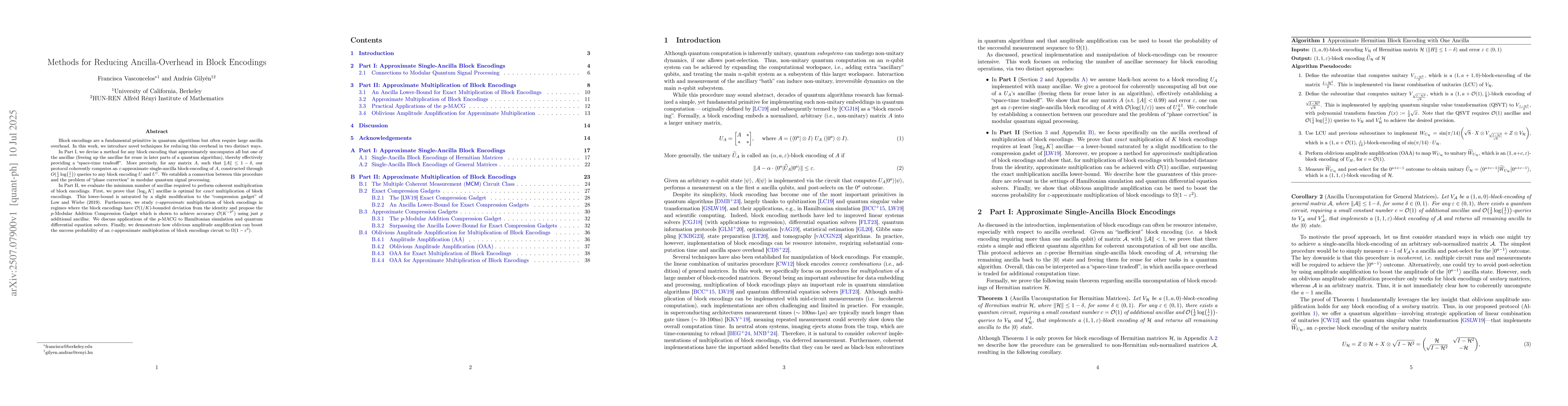 Block encodings are a fundamental primitive in quantum algorithms, but can often have large ancilla overhead. In this work, we introduce novel techniques for reducing this overhead in two distinct ways. In Part I, we prove the existence of a "space-time tradeoff" by deriving an algorithm that, for any block encoding, approximately uncomputes all but one of its ancilla (freeing up those ancillae for reuse in later parts of a quantum algorithm). In Part II, we evaluate the minimum number of ancillae required to perform coherent multiplication of block encodings. We prove that logarithmic ancillae is optimal for exact multiplication of block encodings. However, in certain block encoding regimes, we show that approximate multiplication of block encodings can be achieved to high-precision with just one ancilla.