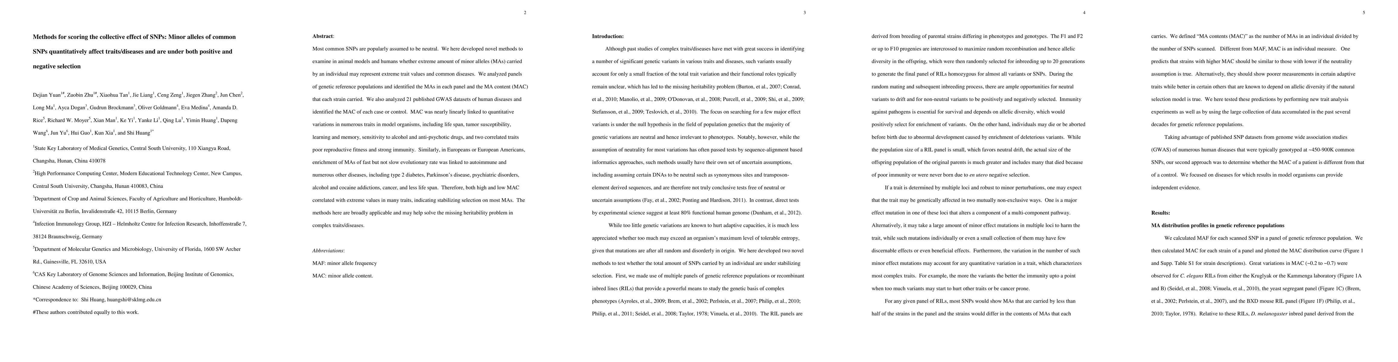 Most common SNPs are popularly assumed to be neutral. We here developed novel methods to examine in animal models and humans whether extreme amount of minor alleles (MAs) carried by an individual may represent extreme trait values and common diseases. We analyzed panels of genetic reference populations and identified the MAs in each panel and the MA content (MAC) that each strain carried. We also analyzed 21 published GWAS datasets of human diseases and identified the MAC of each case or control. MAC was nearly linearly linked to quantitative variations in numerous traits in model organisms, including life span, tumor susceptibility, learning and memory, sensitivity to alcohol and anti-psychotic drugs, and two correlated traits poor reproductive fitness and strong immunity. Similarly, in Europeans or European Americans, enrichment of MAs of fast but not slow evolutionary rate was linked to autoimmune and numerous other diseases, including type 2 diabetes, Parkinson's disease, psychiatric disorders, alcohol and cocaine addictions, cancer, and less life span. Therefore, both high and low MAC correlated with extreme values in many traits, indicating stabilizing selection on most MAs. The methods here are broadly applicable and may help solve the missing heritability problem in complex traits and diseases.