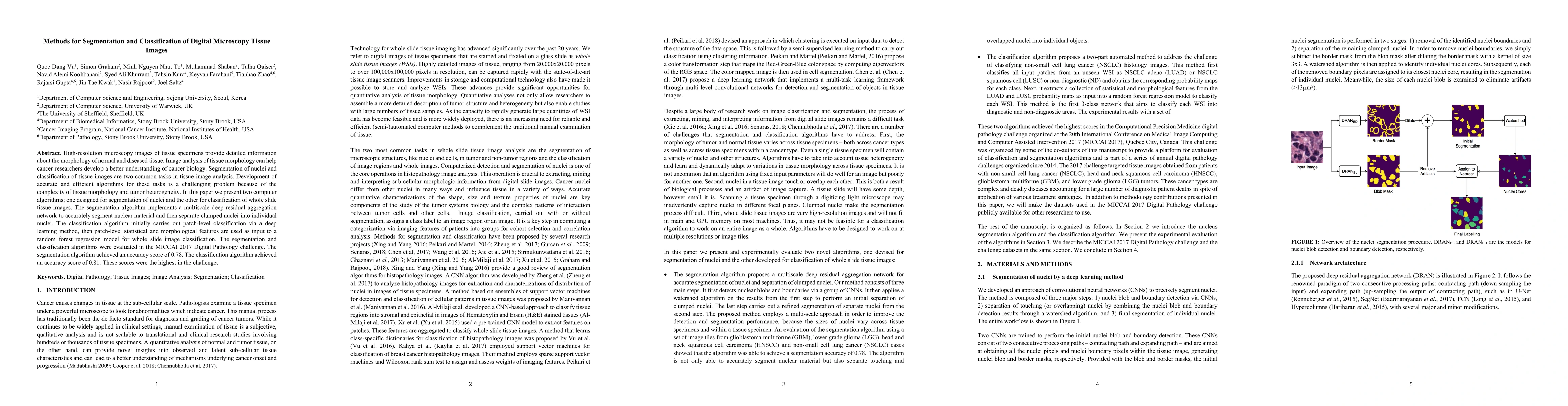 This paper presents two algorithms for analyzing high-resolution digital microscopy tissue images: one for segmenting nuclei using a multiscale deep residual network and another for classifying tissue images via patch-level deep learning and random forest regression. Both algorithms were evaluated in a 2017 pathology challenge, achieving segmentation accuracy of 0.78 and classification accuracy of 0.81.