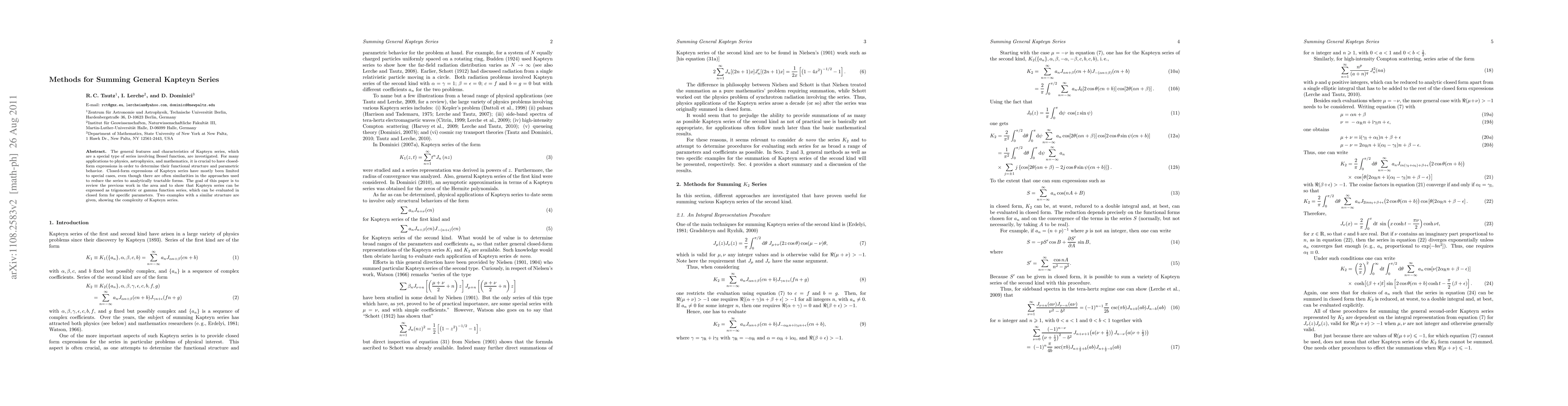 This paper reviews methods for summing general Kapteyn series, which involve Bessel functions, and demonstrates that they can be expressed as trigonometric or gamma function series, providing closed-form expressions for specific parameters. Two complex examples illustrate the series' structure and evaluation.