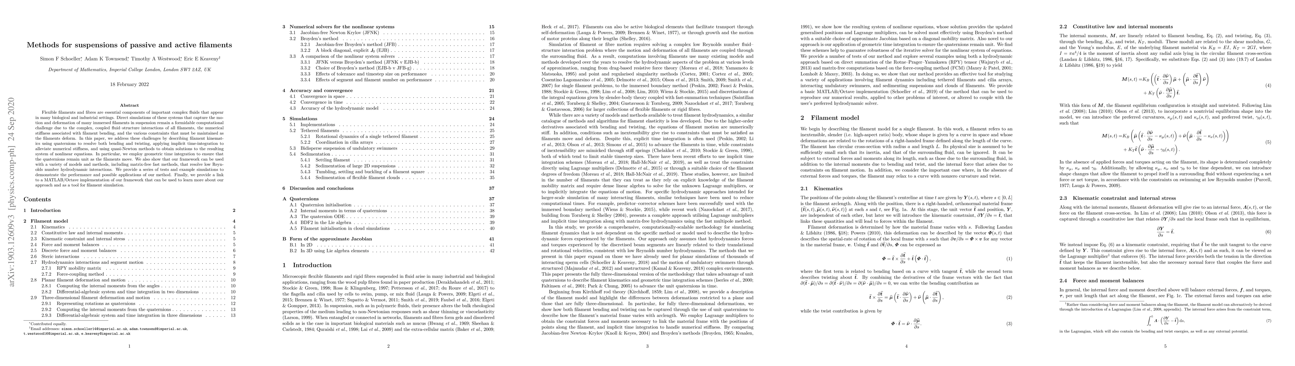 Flexible filaments and fibres are essential components of important complex fluids that appear in many biological and industrial settings. Direct simulations of these systems that capture the motion and deformation of many immersed filaments in suspension remain a formidable computational challenge due to the complex, coupled fluid--structure interactions of all filaments, the numerical stiffness associated with filament bending, and the various constraints that must be maintained as the filaments deform. In this paper, we address these challenges by describing filament kinematics using quaternions to resolve both bending and twisting, applying implicit time-integration to alleviate numerical stiffness, and using quasi-Newton methods to obtain solutions to the resulting system of nonlinear equations. In particular, we employ geometric time integration to ensure that the quaternions remain unit as the filaments move. We also show that our framework can be used with a variety of models and methods, including matrix-free fast methods, that resolve low Reynolds number hydrodynamic interactions. We provide a series of tests and example simulations to demonstrate the performance and possible applications of our method. Finally, we provide a link to a MATLAB/Octave implementation of our framework that can be used to learn more about our approach and as a tool for filament simulation.