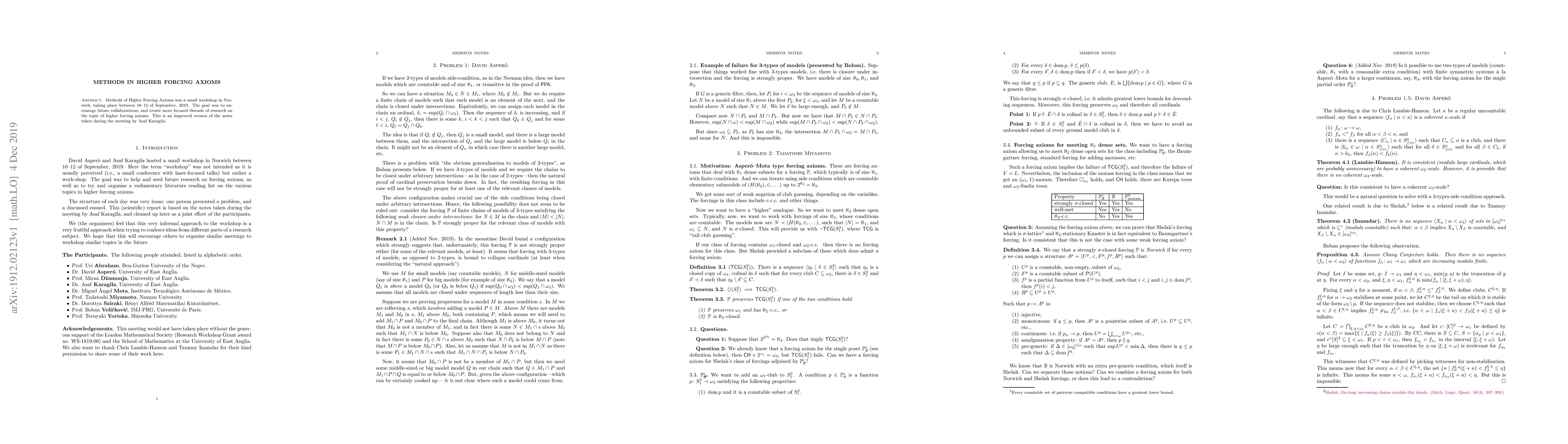 Methods of Higher Forcing Axioms was a small workshop in Norwich, taking place between 10--12 of September, 2019. The goal was to encourage future collaborations, and create more focused threads of research on the topic of higher forcing axioms. This is an improved version of the notes taken during the meeting by Asaf Karagila.