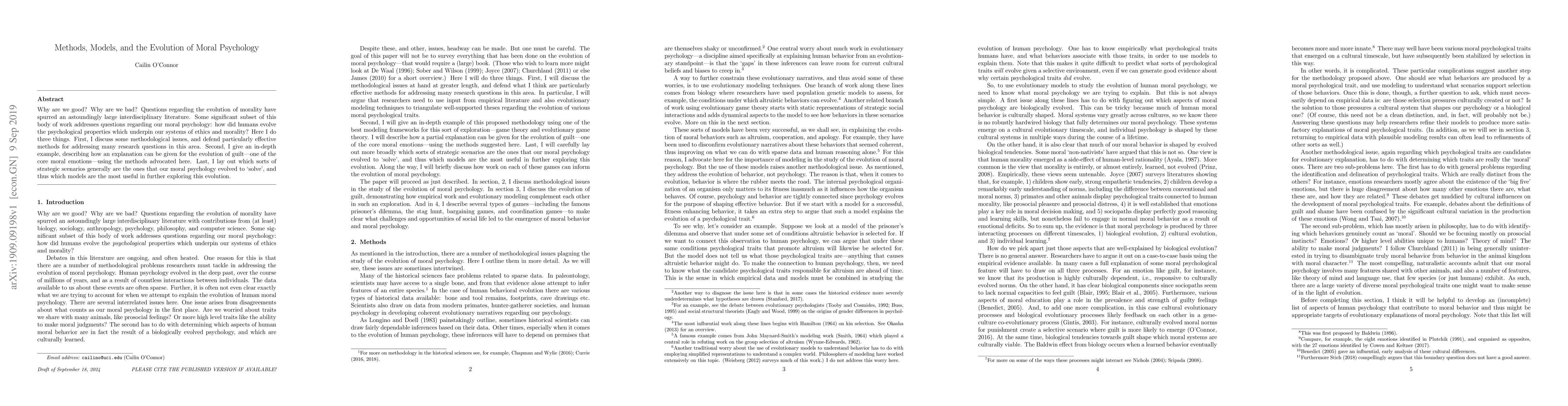 Why are we good? Why are we bad? Questions regarding the evolution of morality have spurred an astoundingly large interdisciplinary literature. Some significant subset of this body of work addresses questions regarding our moral psychology: how did humans evolve the psychological properties which underpin our systems of ethics and morality? Here I do three things. First, I discuss some methodological issues, and defend particularly effective methods for addressing many research questions in this area. Second, I give an in-depth example, describing how an explanation can be given for the evolution of guilt---one of the core moral emotions---using the methods advocated here. Last, I lay out which sorts of strategic scenarios generally are the ones that our moral psychology evolved to `solve', and thus which models are the most useful in further exploring this evolution.