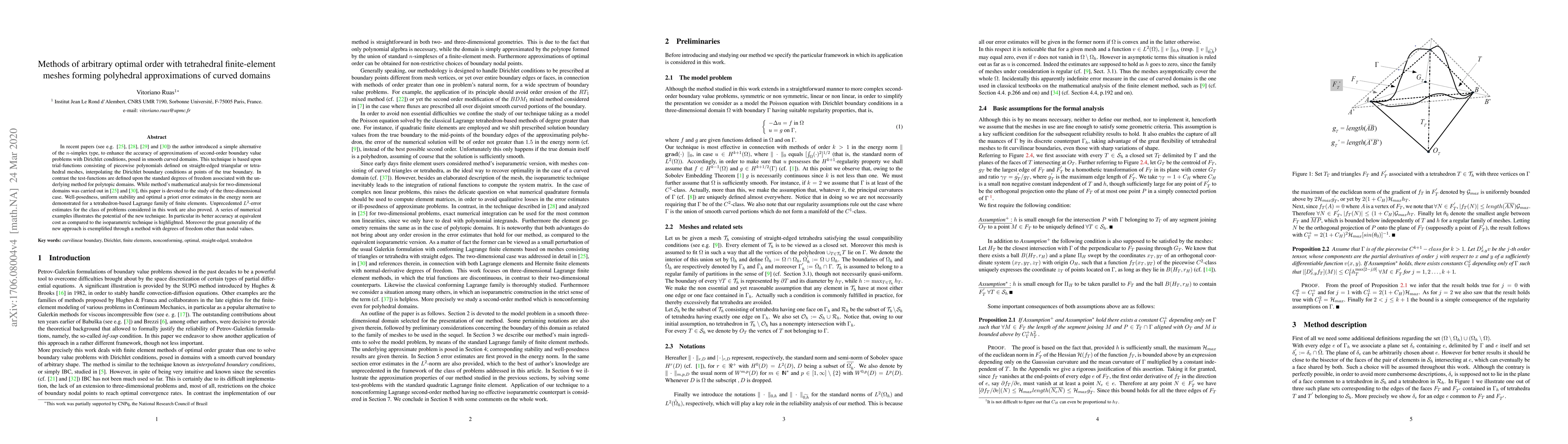 In recent papers the author introduced a simple alternative to isoparametric finite elements of the n-simplex type, to enhance the accuracy of approximations of second-order boundary value problems with Dirichlet conditions, posed in smooth curved domains. This technique is based upon trial-functions consisting of piecewise polynomials defined on straight-edged triangular or tetrahedral meshes, interpolating the Dirichlet boundary conditions at points of the true boundary. In contrast the test-functions are defined upon the standard degrees of freedom associated with the underlying method for polytopic domains. While method's mathematical analysis for both second- and fourth-order problems in two-dimensional domains was carried out in arxiv NA-1701.00663 and in a submitted paper, this article is devoted to the study of the three-dimensional case, in which the method is nonconforming. Well-posedness, uniform stability and optimal a priori error estimates in the energy norm are demonstrated for a tetrahedron-based Lagrange family of finite elements. Novel L2-error estimates for the class of problems considered in this work are also proved. A series of numerical examples illustrates the potential of the new technique. In particular its better accuracy at equivalent cost as compared to the isoparametric technique is highlighted. Moreover the great generality of the new approach is exemplified through a method with degrees of freedom other than nodal values.
