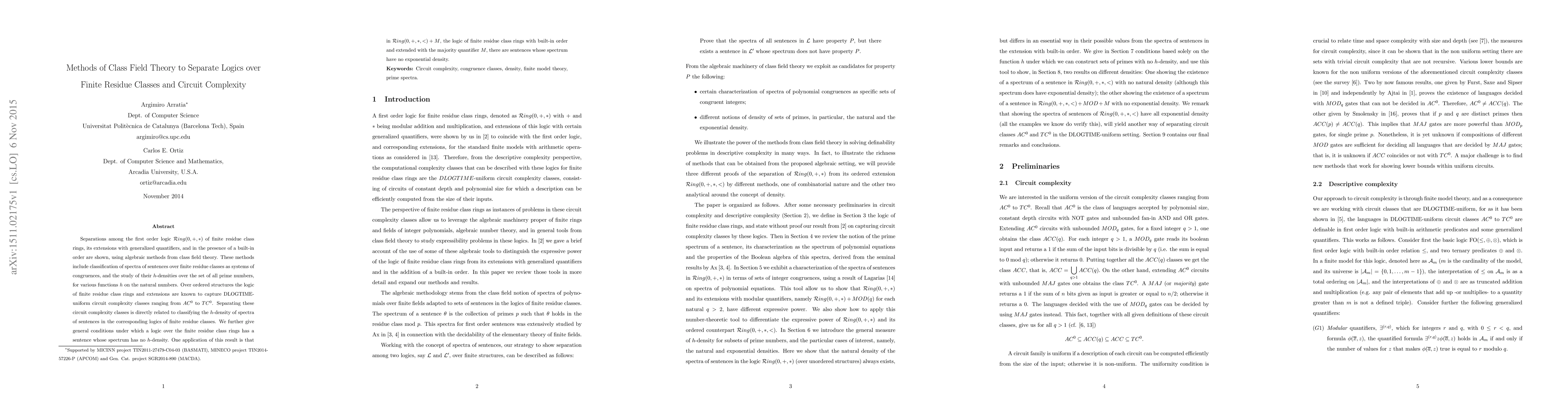Separations among the first order logic ${\cal R}ing(0,+,*)$ of finite residue class rings, its extensions with generalized quantifiers, and in the presence of a built-in order are shown, using algebraic methods from class field theory. These methods include classification of spectra of sentences over finite residue classes as systems of congruences, and the study of their $h$-densities over the set of all prime numbers, for various functions $h$ on the natural numbers. Over ordered structures the logic of finite residue class rings and extensions are known to capture DLOGTIME-uniform circuit complexity classes ranging from $AC^0$ to $TC^0$. Separating these circuit complexity classes is directly related to classifying the $h$-density of spectra of sentences in the corresponding logics of finite residue classes. We further give general conditions under which a logic over the finite residue class rings has a sentence whose spectrum has no $h$-density. One application of this result is that in ${\cal R}ing(0,+,*,<) + M$, the logic of finite residue class rings with built-in order and extended with the majority quantifier $M$, there are sentences whose spectrum have no exponential density.
