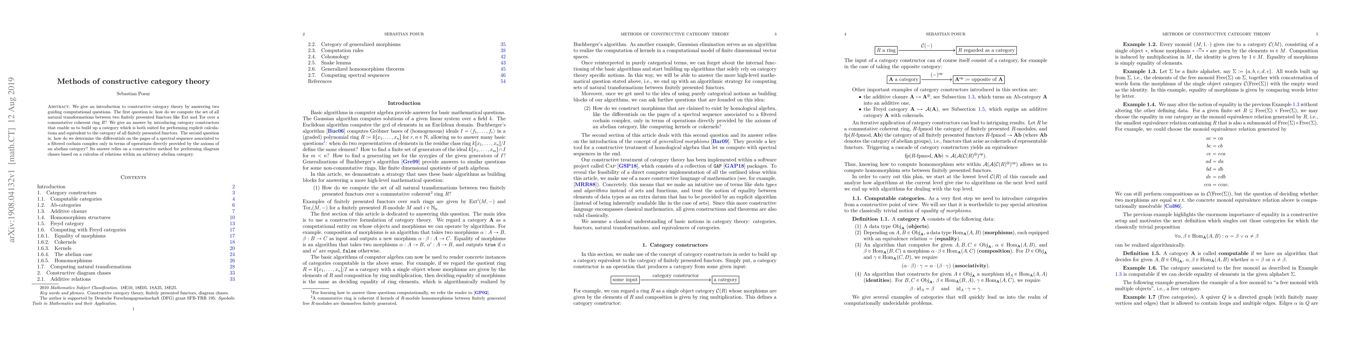 This paper introduces constructive category theory through computational methods, addressing how to compute natural transformations between functors over a commutative ring using category constructors, and how to determine differentials in spectral sequences within abelian categories via a calculus of relations.