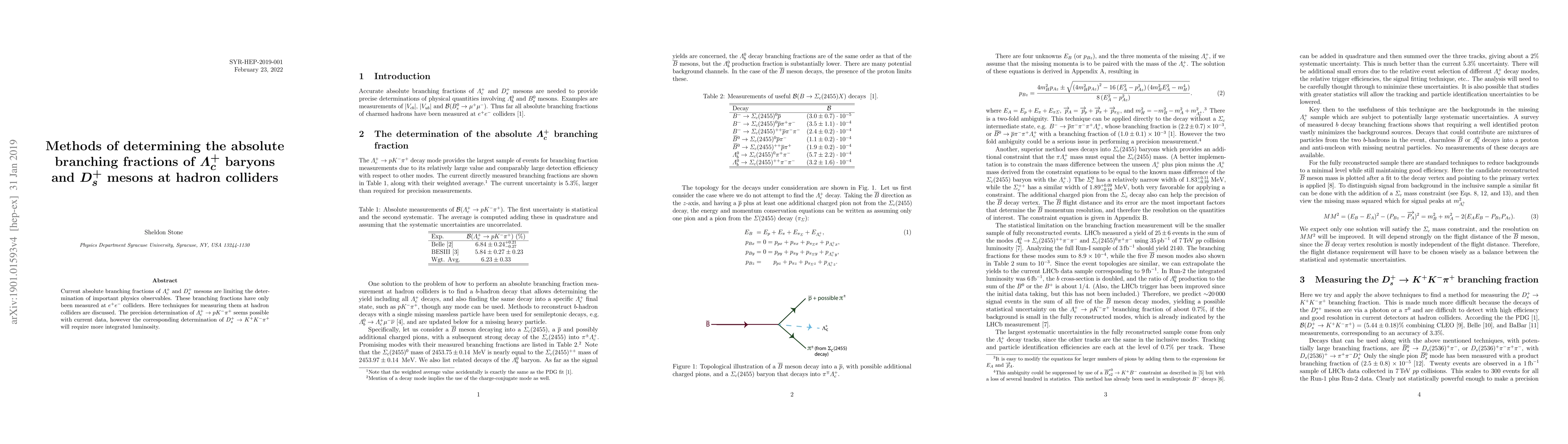 This paper discusses methods for determining the absolute branching fractions of $\Lambda_c^+$ baryons and $D_s^+$ mesons at hadron colliders, where current measurements are limited. While precise determination of $\Lambda_c^+\to p K^-\pi^+$ is feasible with existing data, more integrated luminosity is needed for $D_s^+\to K^+K^-\pi^+$.