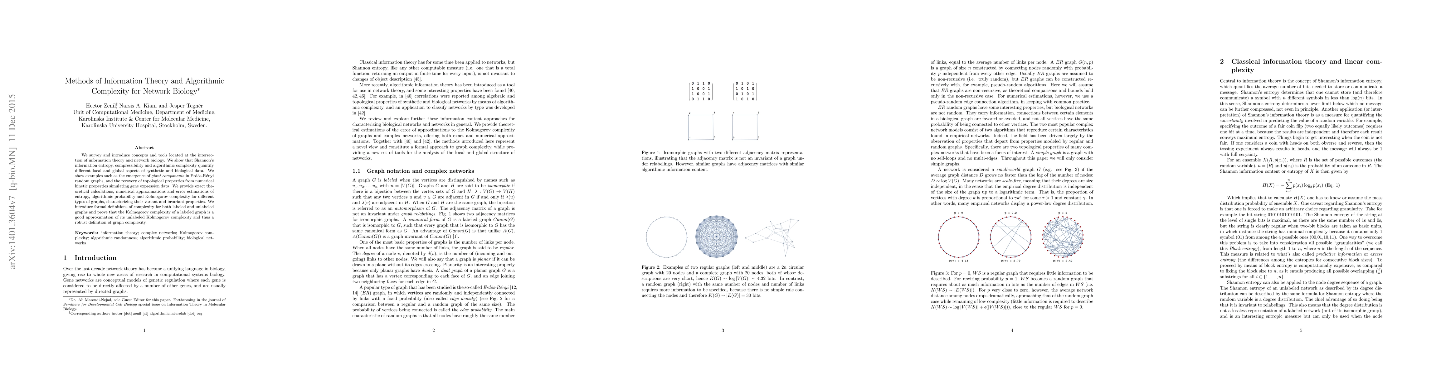 We survey and introduce concepts and tools located at the intersection of information theory and network biology. We show that Shannon's information entropy, compressibility and algorithmic complexity quantify different local and global aspects of synthetic and biological data. We show examples such as the emergence of giant components in Erdos-Renyi random graphs, and the recovery of topological properties from numerical kinetic properties simulating gene expression data. We provide exact theoretical calculations, numerical approximations and error estimations of entropy, algorithmic probability and Kolmogorov complexity for different types of graphs, characterizing their variant and invariant properties. We introduce formal definitions of complexity for both labeled and unlabeled graphs and prove that the Kolmogorov complexity of a labeled graph is a good approximation of its unlabeled Kolmogorov complexity and thus a robust definition of graph complexity.
