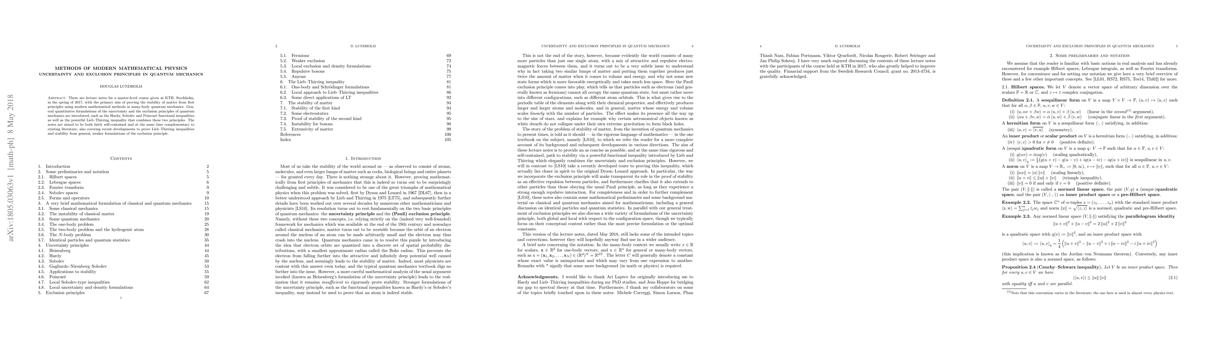 These are lecture notes for a master-level course given at KTH, Stockholm, in the spring of 2017, with the primary aim of proving the stability of matter from first principles using modern mathematical methods in many-body quantum mechanics. General quantitative formulations of the uncertainty and the exclusion principles of quantum mechanics are introduced, such as the Hardy, Sobolev and Poincar\'e functional inequalities as well as the powerful Lieb-Thirring inequality that combines these two principles. The notes are aimed to be both fairly self-contained and at the same time complementary to existing literature, also covering recent developments to prove Lieb-Thirring inequalities and stability from general, weaker formulations of the exclusion principle.