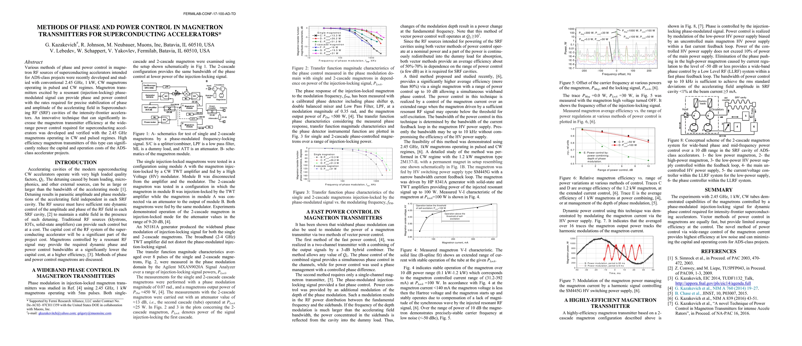 Various methods of phase and power control in magnetron RF sources of superconducting accelerators intended for ADS-class projects were recently developed and studied with conventional 2.45 GHz, 1 kW, CW magnetrons operating in pulsed and CW regimes. Magnetron transmitters excited by a resonant (injection-locking) phasemodulated signal can provide phase and power control with the rates required for precise stabilization of phase and amplitude of the accelerating field in Superconducting RF (SRF) cavities of the intensity-frontier accelerators. An innovative technique that can significantly increase the magnetron transmitter efficiency at the widerange power control required for superconducting accelerators was developed and verified with the 2.45 GHz magnetrons operating in CW and pulsed regimes. High efficiency magnetron transmitters of this type can significantly reduce the capital and operation costs of the ADSclass accelerator projects.