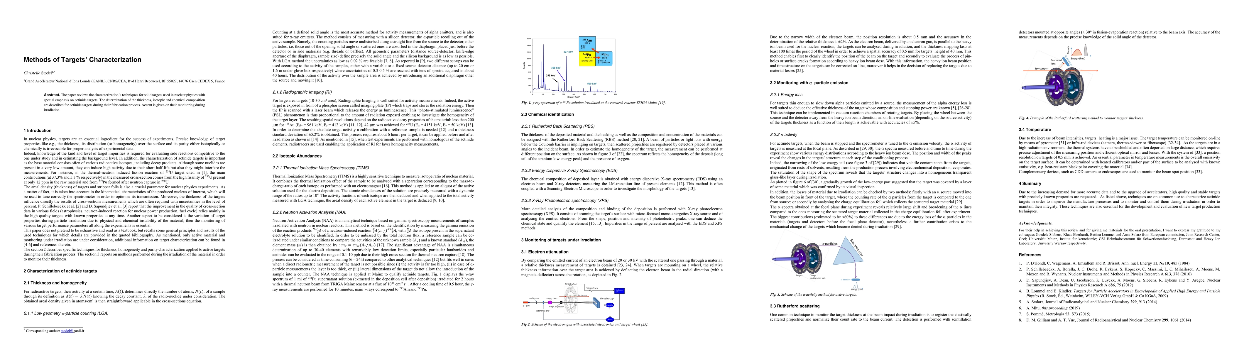 The paper reviews the characterization's techniques for solid targets used in nuclear physics with special emphasis on actinide targets. The determination of the thickness, isotopic and chemical composition are described for actinide targets during their fabrication process. Accent is given on their monitoring during irradiation.