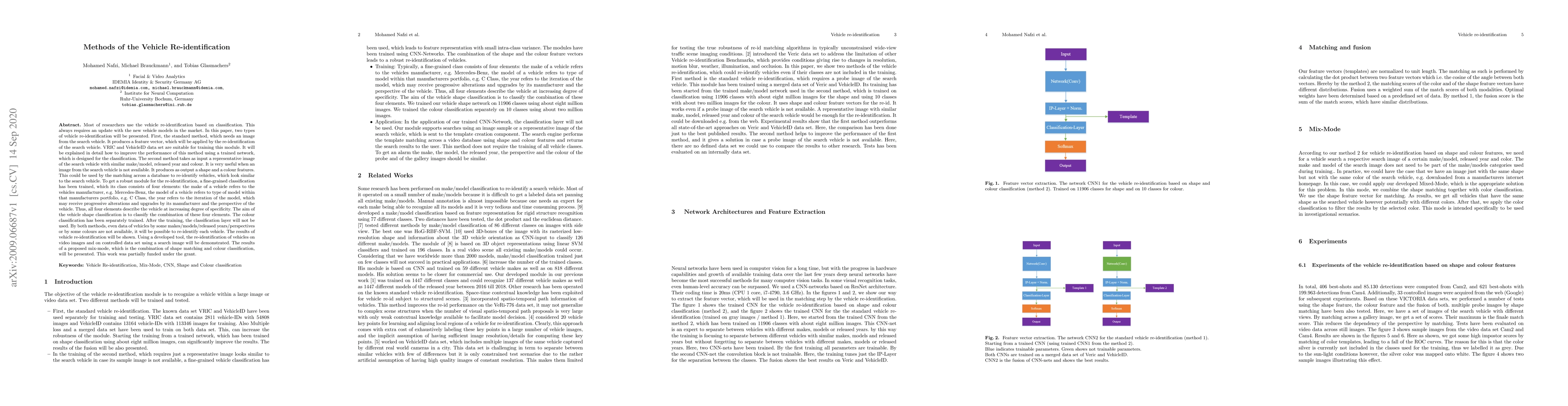 Most of researchers use the vehicle re-identification based on classification. This always requires an update with the new vehicle models in the market. In this paper, two types of vehicle re-identification will be presented. First, the standard method, which needs an image from the search vehicle. VRIC and VehicleID data set are suitable for training this module. It will be explained in detail how to improve the performance of this method using a trained network, which is designed for the classification. The second method takes as input a representative image of the search vehicle with similar make/model, released year and colour. It is very useful when an image from the search vehicle is not available. It produces as output a shape and a colour features. This could be used by the matching across a database to re-identify vehicles, which look similar to the search vehicle. To get a robust module for the re-identification, a fine-grained classification has been trained, which its class consists of four elements: the make of a vehicle refers to the vehicle's manufacturer, e.g. Mercedes-Benz, the model of a vehicle refers to type of model within that manufacturer's portfolio, e.g. C Class, the year refers to the iteration of the model, which may receive progressive alterations and upgrades by its manufacturer and the perspective of the vehicle. Thus, all four elements describe the vehicle at increasing degree of specificity. The aim of the vehicle shape classification is to classify the combination of these four elements. The colour classification has been separately trained. The results of vehicle re-identification will be shown. Using a developed tool, the re-identification of vehicles on video images and on controlled data set will be demonstrated. This work was partially funded under the grant.