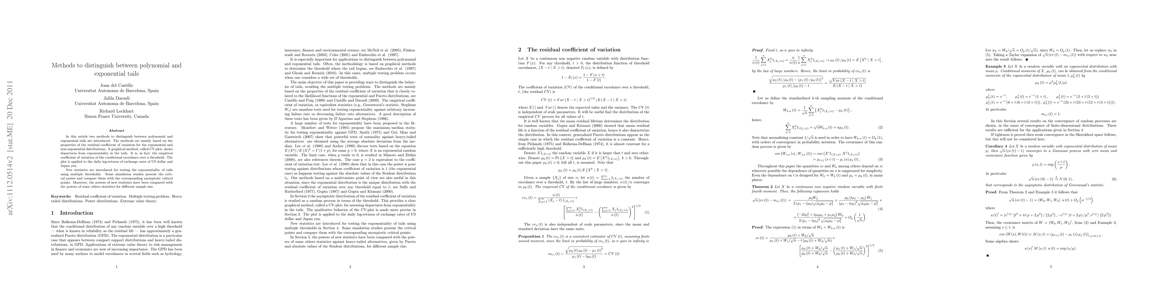 This paper introduces two methods to differentiate between polynomial and exponential tails, focusing on the residual coefficient of variation. It proposes a CV-plot, based on the empirical coefficient of variation of conditional exceedances, and new statistics for testing exponentiality using multiple thresholds, with applications and comparisons to other methods demonstrated through simulations.