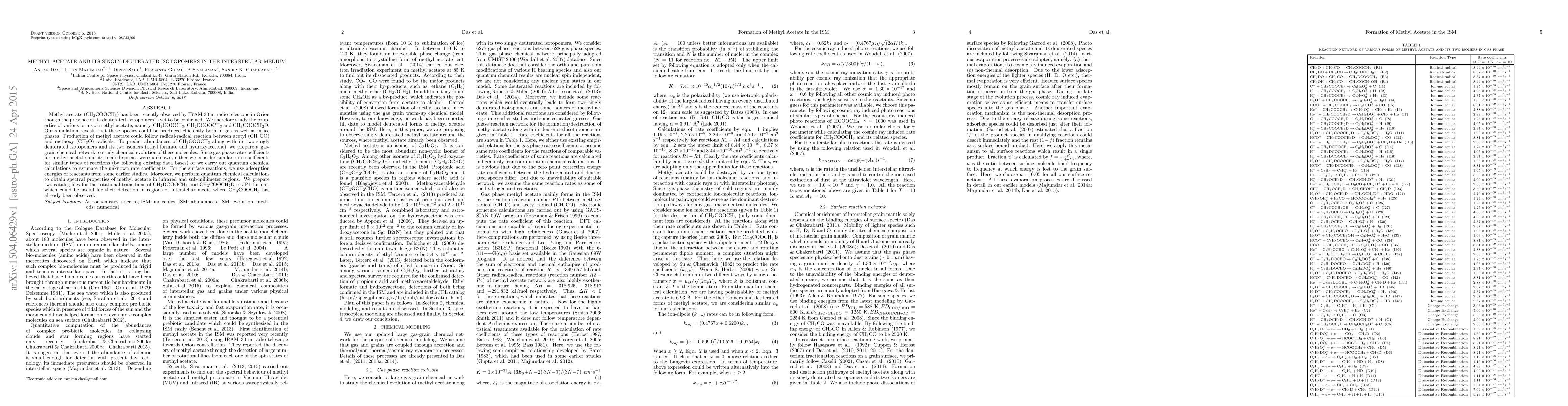 Methyl acetate (CH_3COOCH_3) has been recently observed by IRAM 30 m radio telescope in Orion though the presence of its deuterated isotopomers is yet to be confirmed. We therefore study the properties of various forms of methyl acetate, namely, CH_3COOCH_3, CH_2DCOOCH_3 and CH_3COOCH_2D. Our simulation reveals that these species could be produced efficiently both in gas as well as in ice phases. Production of methyl acetate could follow radical-radical reaction between acetyl (CH_3CO) and methoxy (CH_3O) radicals. To predict abundances of CH_3COOCH_3 along with its two singly deuterated isotopomers and its two isomers (ethyl formate and hydroxyacetone), we prepare a gas-grain chemical network to study chemical evolution of these molecules. Since gas phase rate coefficients for methyl acetate and its related species were unknown, either we consider similar rate coefficients for similar types of reactions (by following existing data bases) or we carry out quantum chemical calculations to estimate the unknown rate coefficients. For the surface reactions, we use adsorption energies of reactants from some earlier studies. Moreover, we perform quantum chemical calculations to obtain spectral properties of methyl acetate in infrared and sub-millimeter regions. We prepare two catalog files for the rotational transitions of CH_2DCOOCH_3 and CH_3COOCH_2D in JPL format, which could be useful for their detection in regions of interstellar media where CH_3COOCH_3 has already been observed.