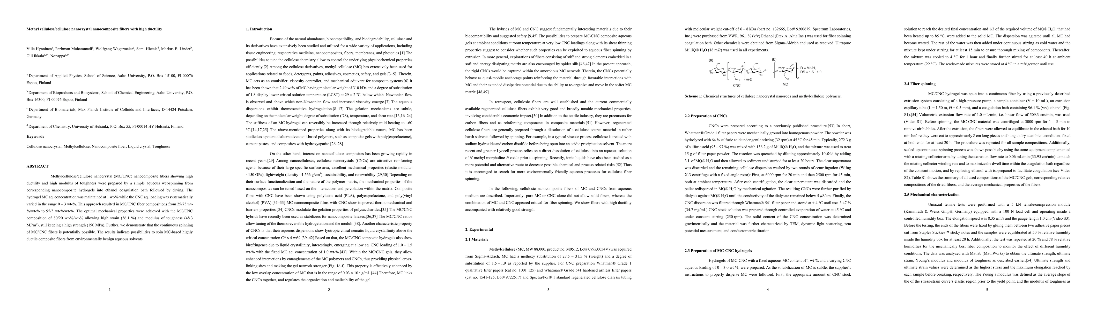 This study developed methylcellulose/cellulose nanocrystal nanocomposite fibers with high ductility and toughness via aqueous wet-spinning, achieving optimal mechanical properties at an 80/20 wt-%/wt-% composition, demonstrating potential for continuous spinning and environmental sustainability.