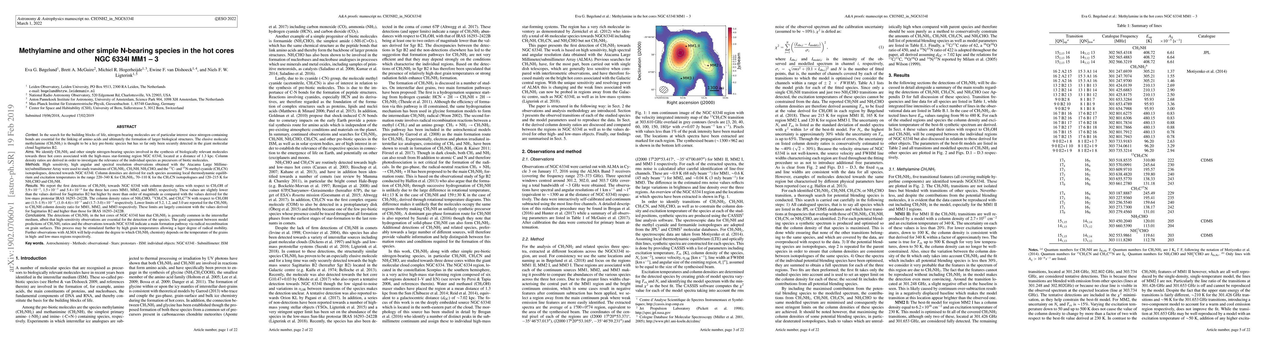 This paper reports the first detections of methylamine (CH$_3$NH$_2$) and other simple nitrogen-bearing species in the hot cores of NGC 6334I using ALMA observations. The findings suggest that CH$_3$NH$_2$ is relatively common in the interstellar medium, with column density ratios indicating its potential as a precursor to biotic molecules.