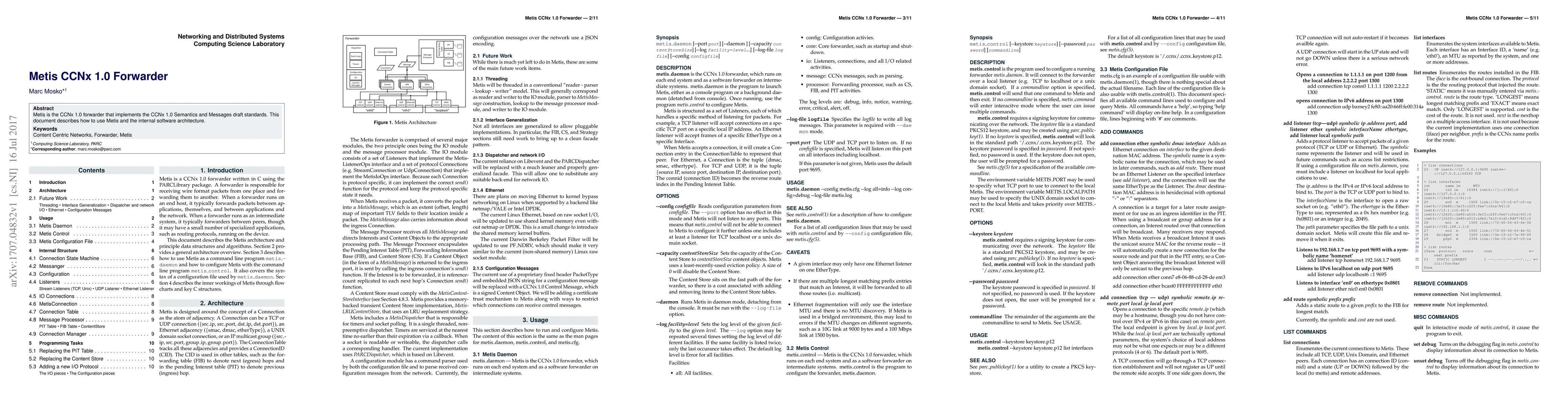 Metis is the CCNx 1.0 forwarder that implements the CCNx 1.0 Semantics and Messages draft standards. This document describes how to use Metis and the internal software architecture.