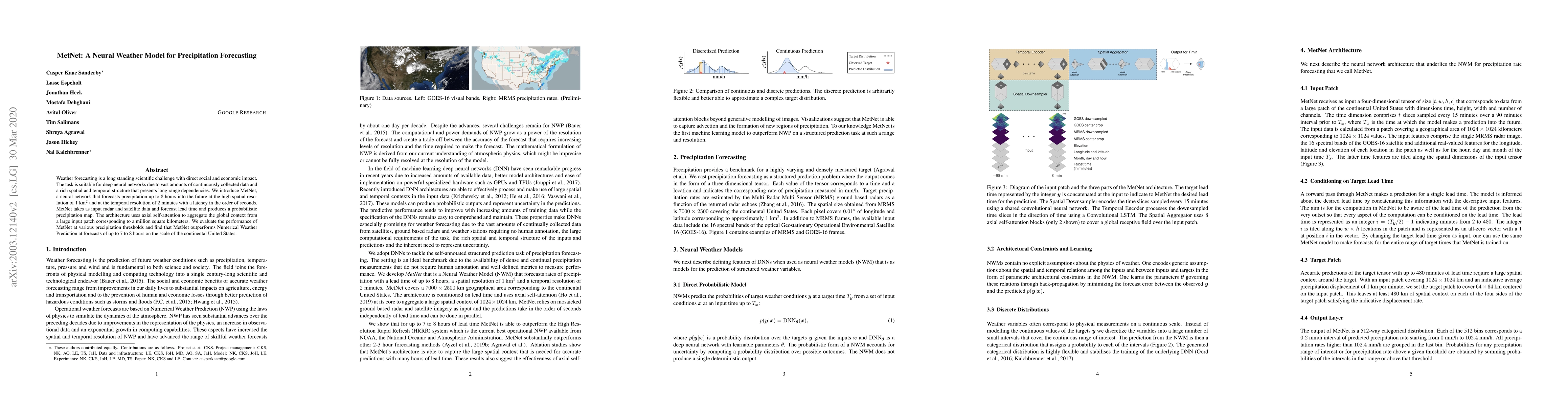 Weather forecasting is a long standing scientific challenge with direct social and economic impact. The task is suitable for deep neural networks due to vast amounts of continuously collected data and a rich spatial and temporal structure that presents long range dependencies. We introduce MetNet, a neural network that forecasts precipitation up to 8 hours into the future at the high spatial resolution of 1 km$^2$ and at the temporal resolution of 2 minutes with a latency in the order of seconds. MetNet takes as input radar and satellite data and forecast lead time and produces a probabilistic precipitation map. The architecture uses axial self-attention to aggregate the global context from a large input patch corresponding to a million square kilometers. We evaluate the performance of MetNet at various precipitation thresholds and find that MetNet outperforms Numerical Weather Prediction at forecasts of up to 7 to 8 hours on the scale of the continental United States.