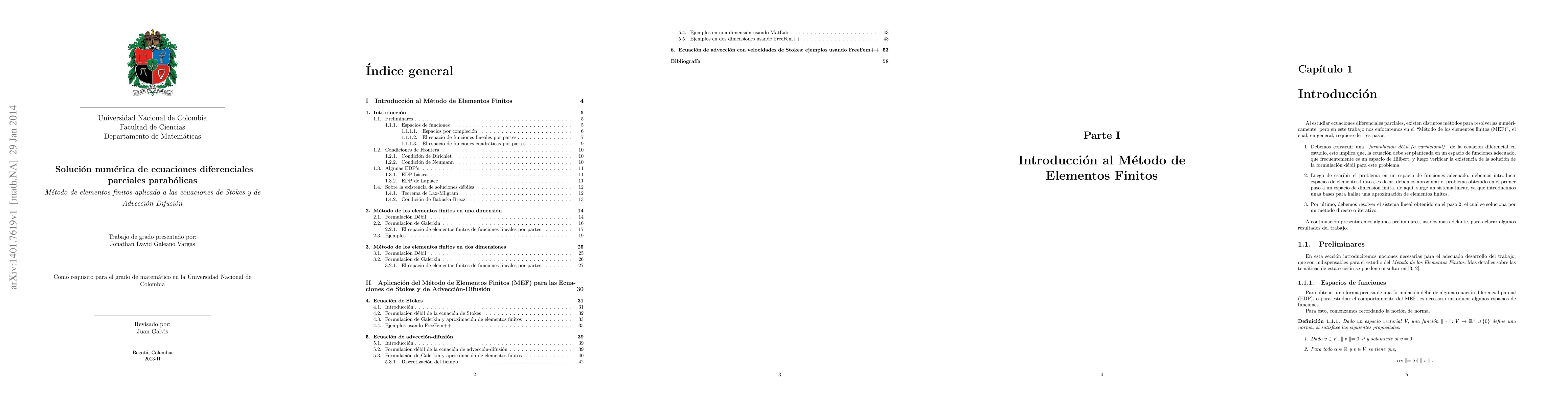 This work consists in two parts. The first part is a review of the finite element method (FEM) for one and two-dimensional problems. The second part, concerns the application of the FEM to find numerical solutions of the Stokes equation and the Convection-Diffusion equation. Finally, it couples the stokes velocity to be the convection of the Convection-Diffusion equation.