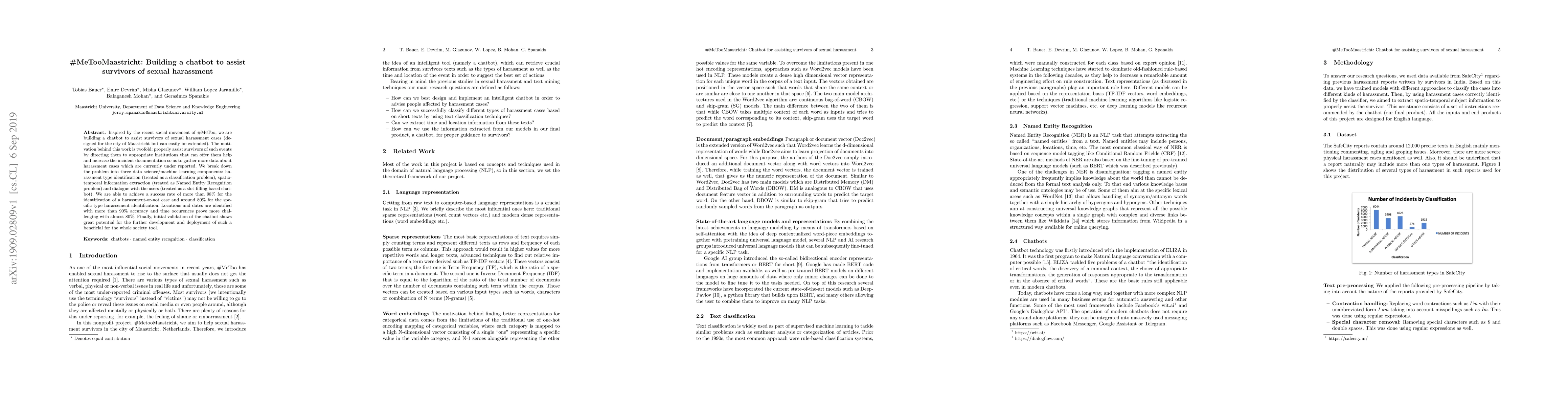 The paper describes the development of a chatbot, inspired by the #MeToo movement, to assist survivors of sexual harassment by directing them to help resources and improving incident documentation. The chatbot achieves high accuracy in identifying harassment cases and extracting relevant spatio-temporal information, showing promising potential for broader deployment.