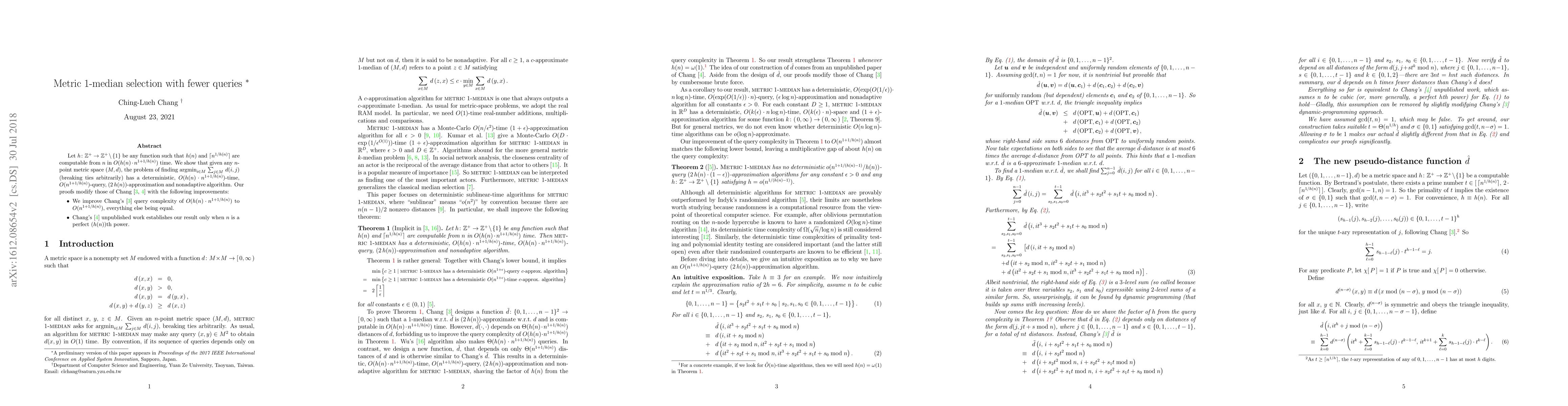 Let $h\colon\mathbb{Z}^+\to\mathbb{Z}^+\setminus\{1\}$ be any function such that $h(n)$ and $\lceil n^{1/h(n)}\rceil$ are computable from $n$ in $O(h(n)\cdot n^{1+1/h(n)})$ time. We show that given any $n$-point metric space $(M,d)$, the problem of finding $\mathop{\mathrm{argmin}}_{i\in M}\,\sum_{j\in M}\,d(i,j)$ (breaking ties arbitrarily) has a deterministic, $O(h(n)\cdot n^{1+1/h(n)})$-time, $O(n^{1+1/h(n)})$-query, $(2\,h(n))$-approximation and nonadaptive algorithm. Our proofs modify those of Chang~\cite{Cha15, Cha15CMCT} with the following improvements: (1) We improve Chang's~\cite{Cha15} query complexity of $O(h(n)\cdot n^{1+1/h(n)})$ to $O(n^{1+1/h(n)})$, everything else being equal. (2) Chang's~\cite{Cha15CMCT} unpublished work establishes our result only when $n$ is a perfect $(h(n))$th power.