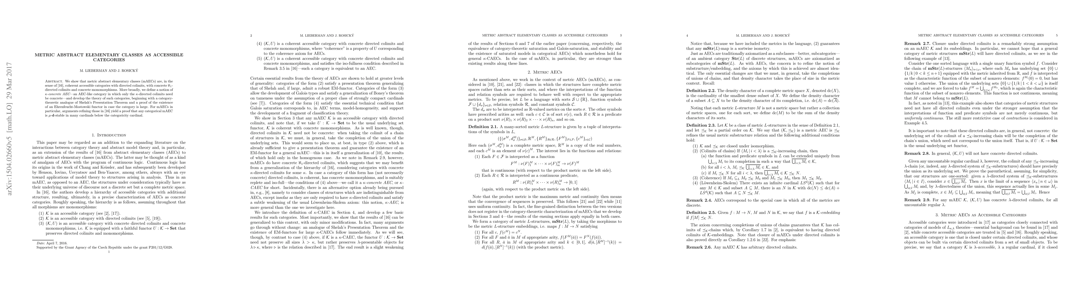 Summary: This paper demonstrates that metric abstract elementary classes (mAECs) form accessible categories with directed colimits and specific constructions. It introduces $\kappa$-concrete AECs and develops their theory, proving stability properties for categorical mAECs.