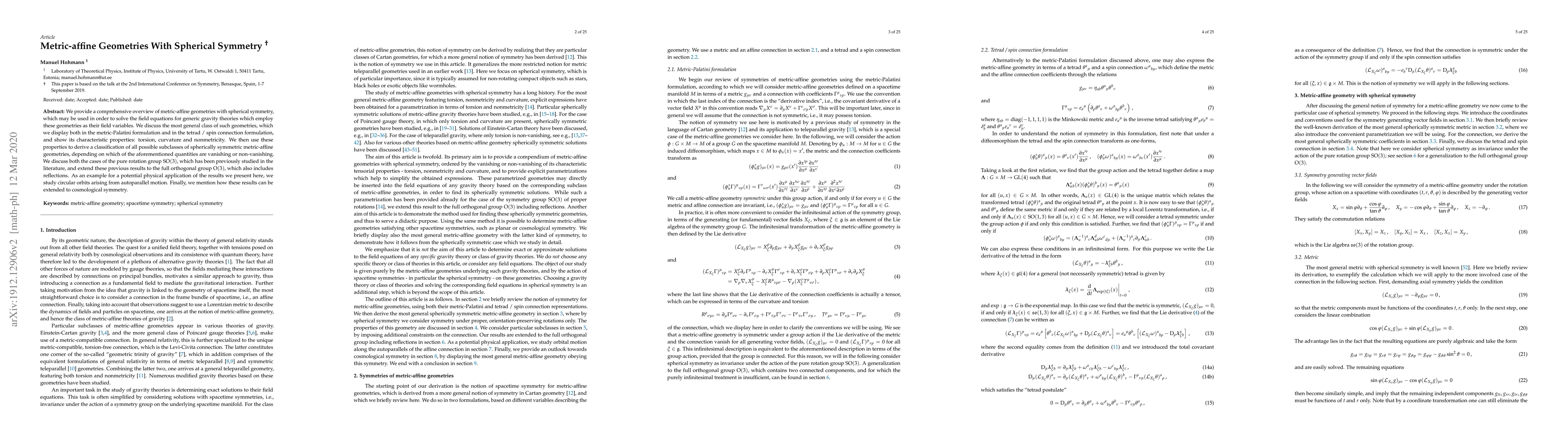 The paper provides a comprehensive overview of metric-affine geometries with spherical symmetry, discussing their properties and classifying possible subclasses based on torsion, curvature, and nonmetricity characteristics.