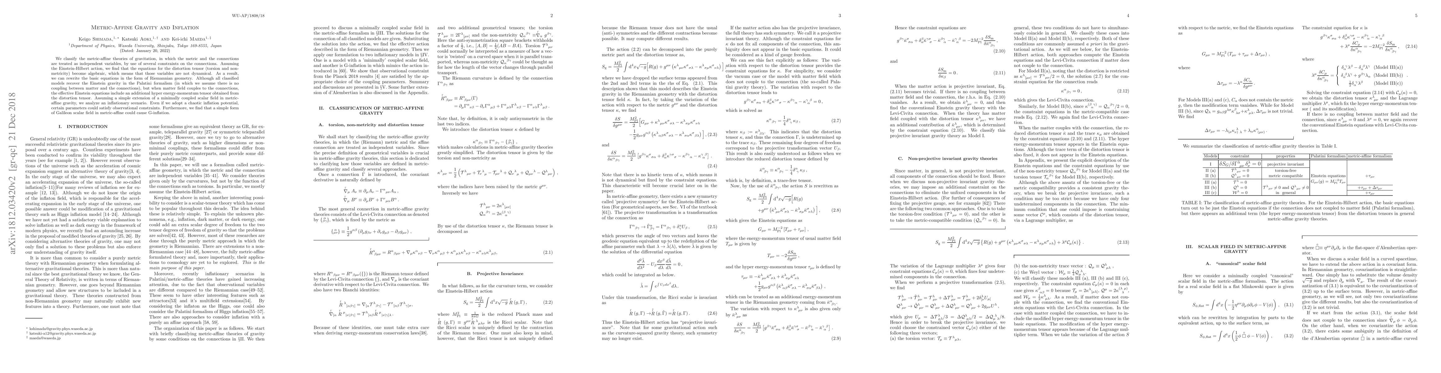This paper classifies metric-affine gravity theories, showing that the distortion tensor is algebraic and non-dynamical, allowing reformulation in Riemannian geometry. It demonstrates how coupling matter fields to connections modifies Einstein equations, introducing a hyper energy-momentum tensor. An inflationary scenario based on a scalar field extension shows potential compatibility with observational constraints and explores G-inflation via a Galileon scalar field.