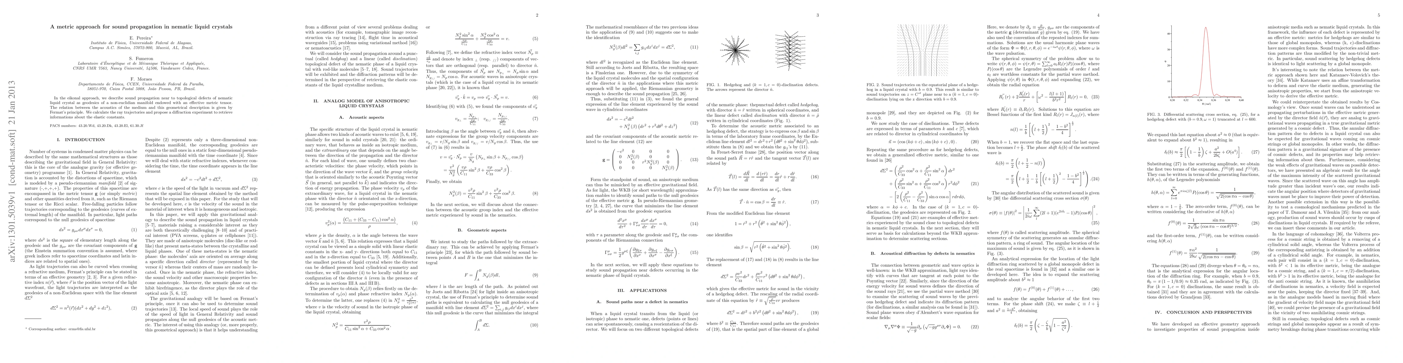 Researchers used a metric approach to describe sound propagation in nematic liquid crystals, proposing a new way to understand how sound waves behave near defects in these materials. They also suggested experiments to measure the material's elastic properties.