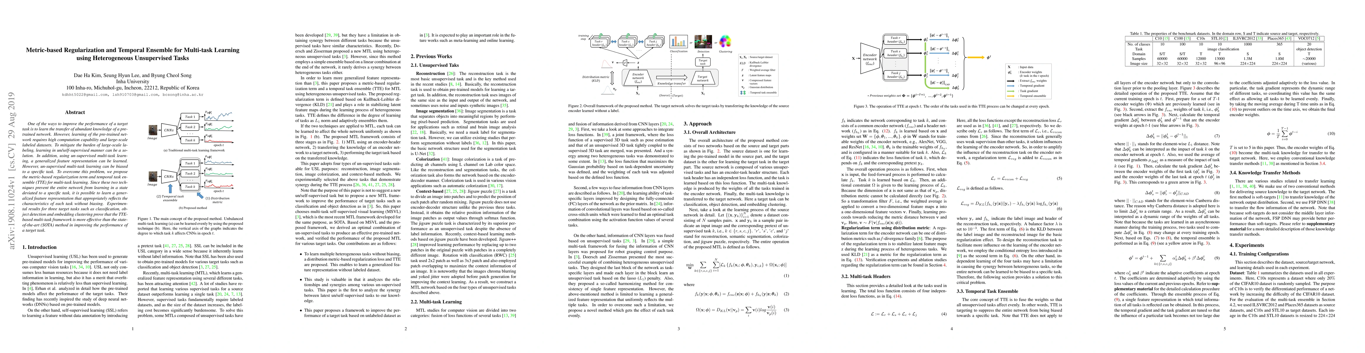 One of the ways to improve the performance of a target task is to learn the transfer of abundant knowledge of a pre-trained network. However, learning of the pre-trained network requires high computation capability and large-scale labeled dataset. To mitigate the burden of large-scale labeling, learning in un/self-supervised manner can be a solution. In addition, using unsupervised multi-task learning, a generalized feature representation can be learned. However, unsupervised multi-task learning can be biased to a specific task. To overcome this problem, we propose the metric-based regularization term and temporal task ensemble (TTE) for multi-task learning. Since these two techniques prevent the entire network from learning in a state deviated to a specific task, it is possible to learn a generalized feature representation that appropriately reflects the characteristics of each task without biasing. Experimental results for three target tasks such as classification, object detection and embedding clustering prove that the TTE-based multi-task framework is more effective than the state-of-the-art (SOTA) method in improving the performance of a target task.