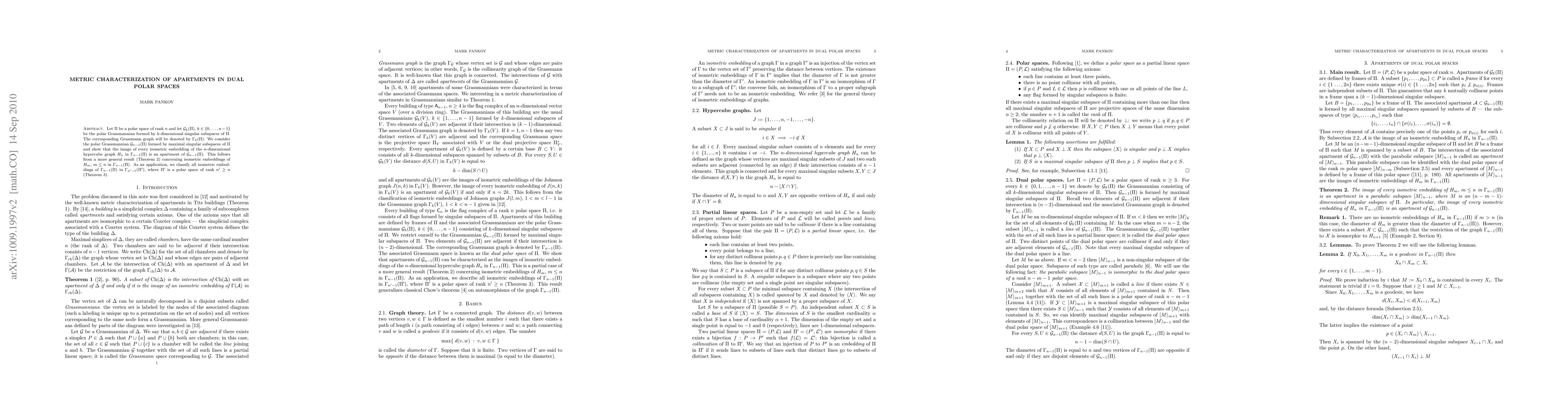 This research characterizes apartments in dual polar spaces by showing that isometric embeddings of hypercube graphs into the corresponding polar Grassmann graph result in apartments. It further classifies such embeddings between polar spaces of different ranks.