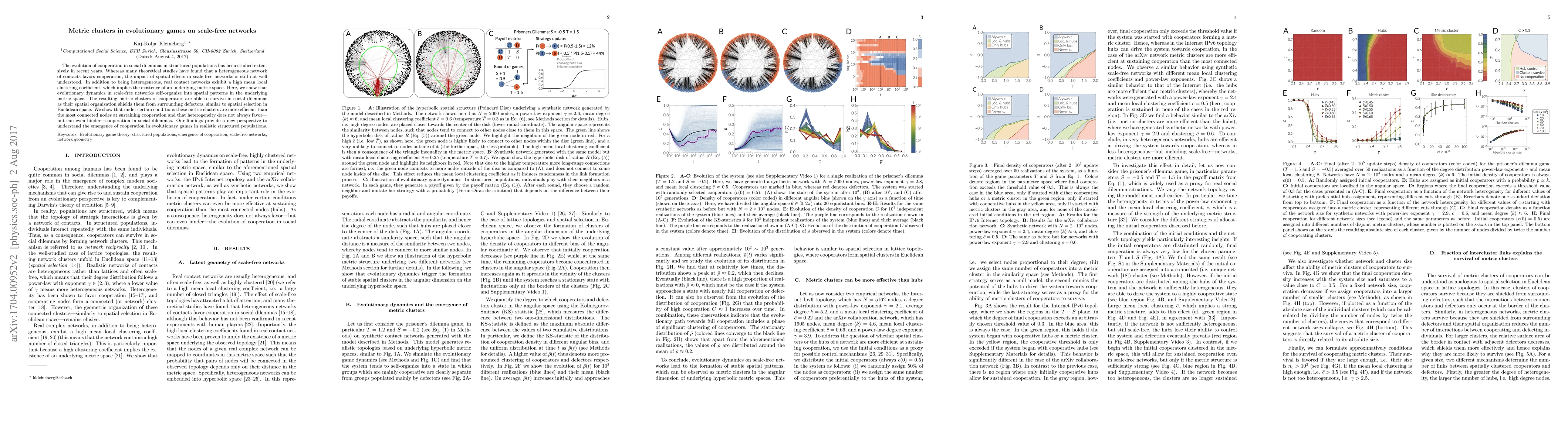 This paper investigates how cooperation evolves in social dilemmas on scale-free networks, revealing that evolutionary dynamics form spatial metric clusters that enhance cooperation. These clusters outperform highly connected nodes in sustaining cooperation, challenging the notion that network heterogeneity always promotes cooperation.