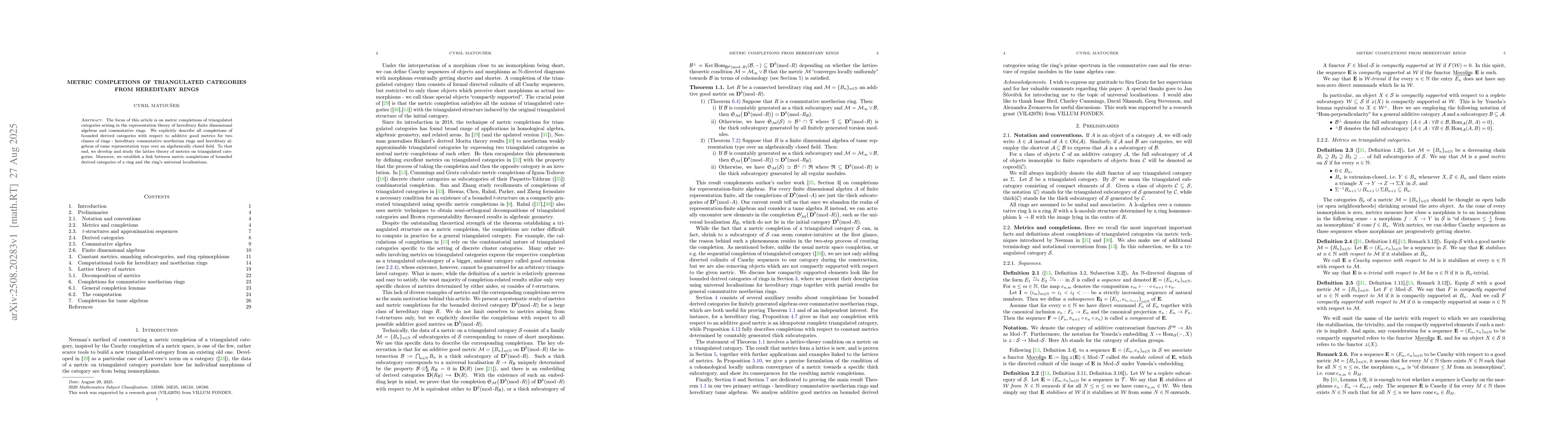 The focus of this article is on metric completions of triangulated categories arising in the representation theory of hereditary finite dimensional algebras and commutative rings. We explicitly describe all completions of bounded derived categories with respect to additive good metrics for two classes of rings - hereditary commutative noetherian rings and hereditary algebras of tame representation type over an algebraically closed field. To that end, we develop and study the lattice theory of metrics on triangulated categories. Moreover, we establish a link between metric completions of bounded derived categories of a ring and the ring's universal localisations.