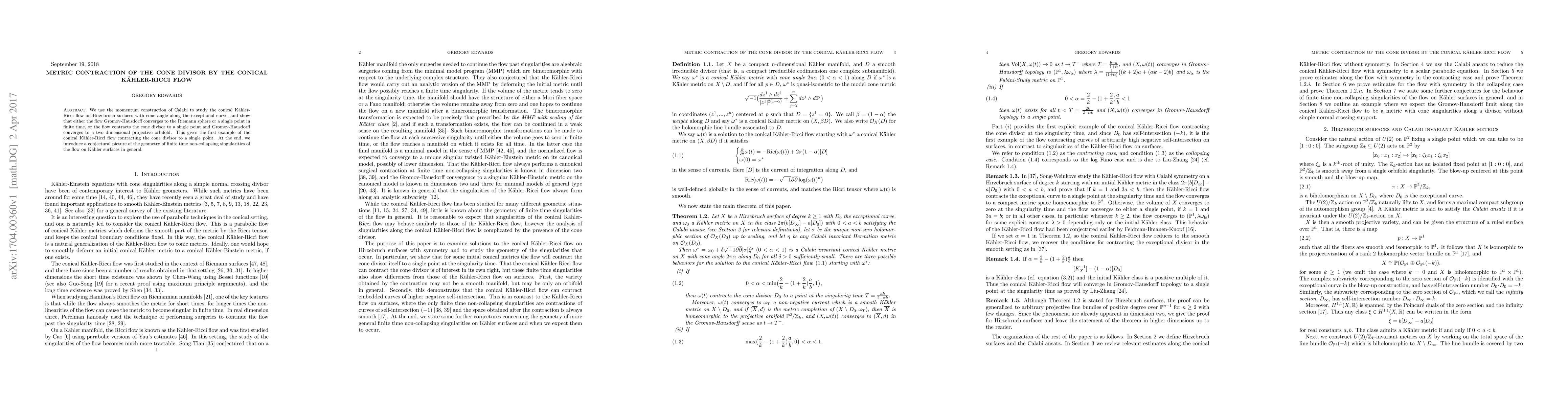 We use the momentum construction of Calabi to study the conical K\"ahler-Ricci flow on Hirzebruch surfaces with cone angle along the exceptional curve, and show that either the flow Gromov-Hausdorff converges to the Riemann sphere or a single point in finite time, or the flow contracts the cone divisor to a single point and Gromov-Hausdorff converges to a two dimensional projective orbifold. This gives the first example of the conical K\"ahler-Ricci flow contracting the cone divisor to a single point. At the end, we introduce a conjectural picture of the geometry of finite time non-collapsing singularities of the flow on K\"ahler surfaces in general.