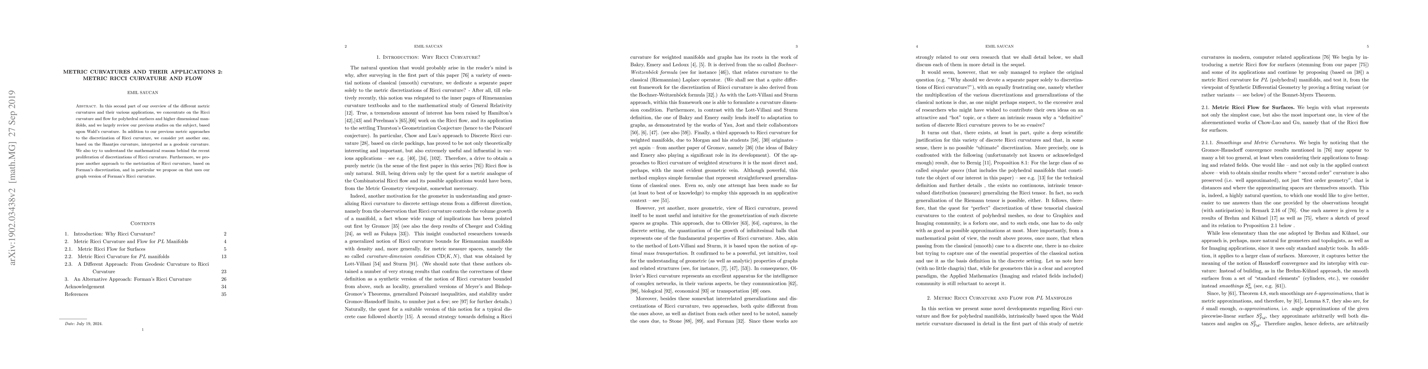 In this second part of our overview of the different metric curvatures and their various applications, we concentrate on the Ricci curvature and flow for polyhedral surfaces and higher dimensional manifolds, and we largely review our previous studies on the subject, based upon Wald's curvature. In addition to our previous metric approaches to the discretization of Ricci curvature, we consider yet another one, based on the Haantjes curvature, interpreted as a geodesic curvature. We also try to understand the mathematical reasons behind the recent proliferation of discretizations of Ricci curvature. Furthermore, we propose another approach to the metrization of Ricci curvature, based on Forman's discretization, and in particular we propose on that uses our graph version of Forman's Ricci curvature.