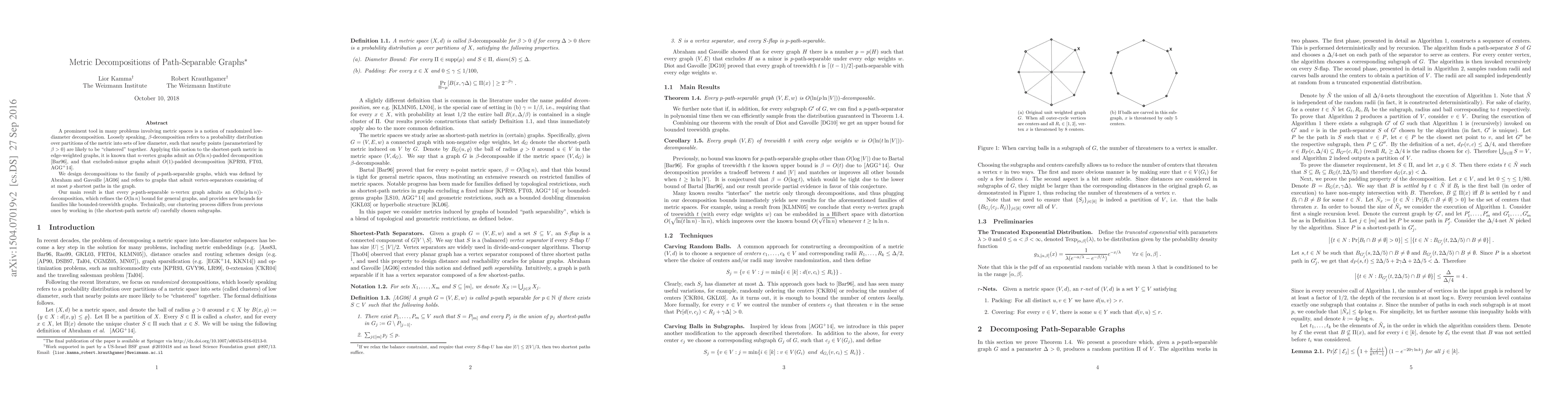 A prominent tool in many problems involving metric spaces is a notion of randomized low-diameter decomposition. Loosely speaking, $\beta$-decomposition refers to a probability distribution over partitions of the metric into sets of low diameter, such that nearby points (parameterized by $\beta>0$) are likely to be "clustered" together. Applying this notion to the shortest-path metric in edge-weighted graphs, it is known that $n$-vertex graphs admit an $O(\ln n)$-padded decomposition (Bartal, 1996), and that excluded-minor graphs admit $O(1)$-padded decomposition (Klein, Plotkin and Rao 1993, Fakcharoenphol and Talwar 2003, Abraham et al. 2014). We design decompositions to the family of $p$-path-separable graphs, which was defined by Abraham and Gavoille (2006). and refers to graphs that admit vertex-separators consisting of at most $p$ shortest paths in the graph. Our main result is that every $p$-path-separable $n$-vertex graph admits an $O(\ln (p \ln n))$-decomposition, which refines the $O(\ln n)$ bound for general graphs, and provides new bounds for families like bounded-treewidth graphs. Technically, our clustering process differs from previous ones by working in (the shortest-path metric of) carefully chosen subgraphs.