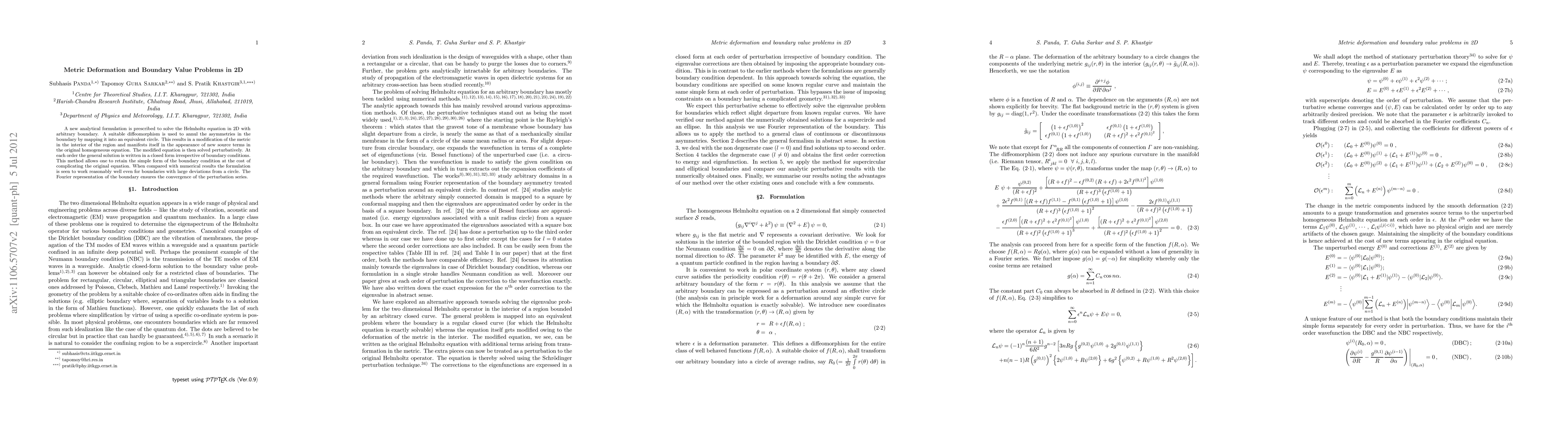 A new analytical formulation is prescribed to solve the Helmholtz equation in 2D with arbitrary boundary. A suitable diffeomorphism is used to annul the asymmetries in the boundary by mapping it into an equivalent circle. This results in a modification of the metric in the interior of the region and manifests itself in the appearance of new source terms in the original homogeneous equation. The modified equation is then solved perturbatively. At each order the general solution is written in a closed form irrespective of boundary conditions. This method allows one to retain the simple form of the boundary condition at the cost of complicating the original equation. When compared with numerical results the formulation is seen to work reasonably well even for boundaries with large deviations from a circle. The Fourier representation of the boundary ensures the convergence of the perturbation series.