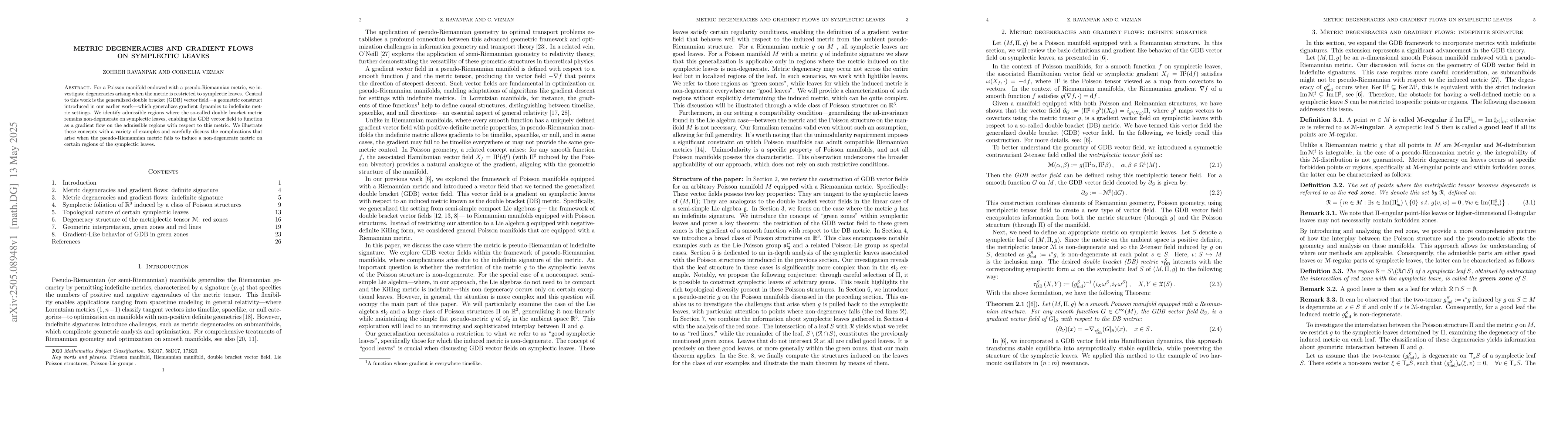 The research investigates degeneracies of a pseudo-Riemannian metric on symplectic leaves of a Poisson manifold, utilizing the generalized double bracket (GDB) vector field as a tool for gradient dynamics in indefinite metric settings.