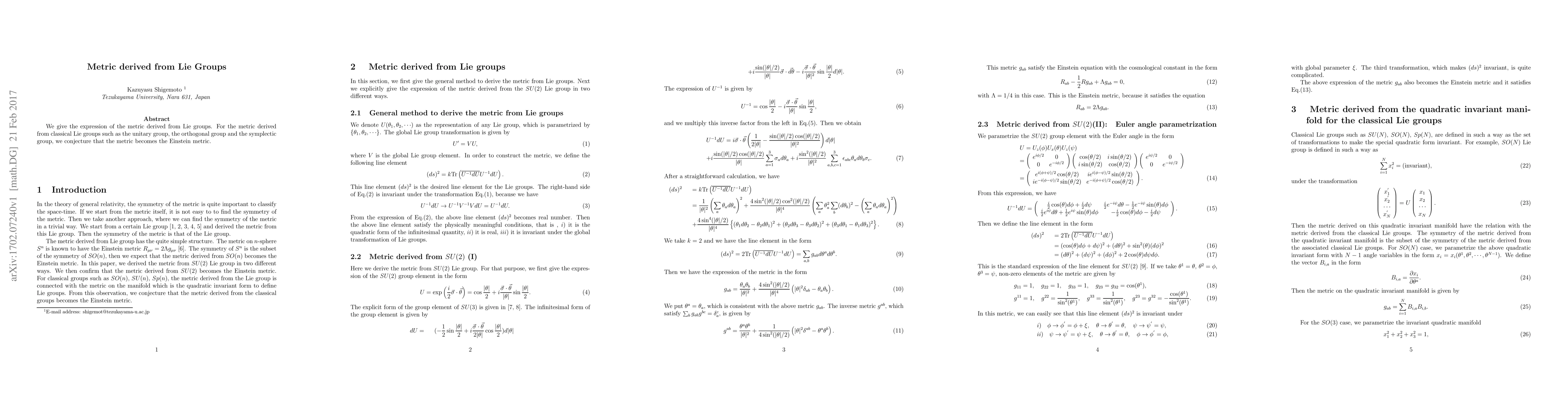 We give the expression of the metric derived from Lie groups. For the metric derived from classical Lie groups such as the unitary group, the orthogonal group and the symplectic group, we conjecture that the metric becomes the Einstein metric.