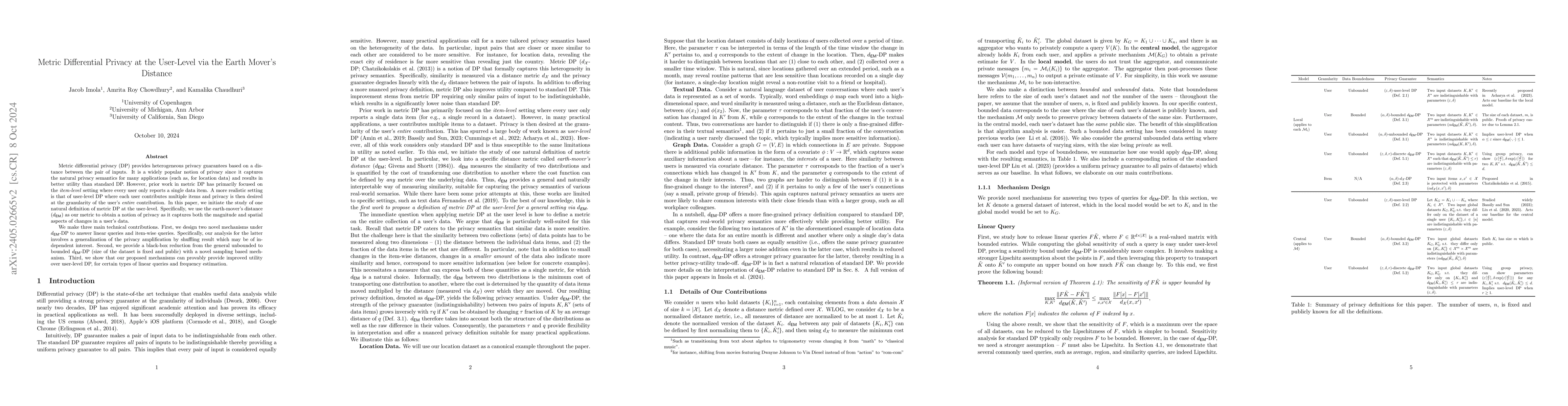 This paper initiates the study of metric differential privacy (DP) at the user-level, where each user contributes multiple data items, and privacy is evaluated based on the user's entire contribution. The authors propose novel mechanisms using the earth-mover's distance to achieve $d_\textsf{EM}$-DP, showing improved utility over traditional DP for linear and frequency queries.