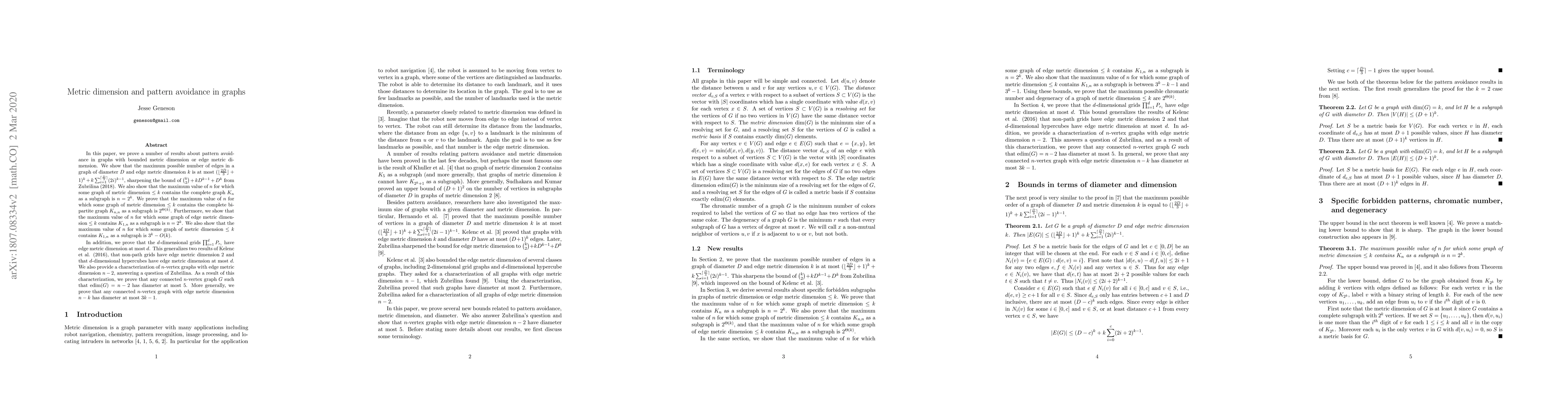 In this paper, we prove a number of results about pattern avoidance in graphs with bounded metric dimension or edge metric dimension. We show that the maximum possible number of edges in a graph of diameter $D$ and edge metric dimension $k$ is at most $(\lfloor \frac{2D}{3}\rfloor +1)^{k}+k \sum_{i = 1}^{\lceil \frac{D}{3}\rceil } (2i)^{k-1}$, sharpening the bound of $\binom{k}{2}+k D^{k-1}+D^{k}$ from Zubrilina (2018). We also show that the maximum value of $n$ for which some graph of metric dimension $\leq k$ contains the complete graph $K_{n}$ as a subgraph is $n = 2^{k}$. We prove that the maximum value of $n$ for which some graph of metric dimension $\leq k$ contains the complete bipartite graph $K_{n,n}$ as a subgraph is $2^{\Theta(k)}$. Furthermore, we show that the maximum value of $n$ for which some graph of edge metric dimension $\leq k$ contains $K_{1,n}$ as a subgraph is $n = 2^{k}$. We also show that the maximum value of $n$ for which some graph of metric dimension $\leq k$ contains $K_{1,n}$ as a subgraph is $3^{k}-O(k)$. In addition, we prove that the $d$-dimensional grids $\prod_{i = 1}^{d} P_{r_{i}}$ have edge metric dimension at most $d$. This generalizes two results of Kelenc et al. (2016), that non-path grids have edge metric dimension $2$ and that $d$-dimensional hypercubes have edge metric dimension at most $d$. We also provide a characterization of $n$-vertex graphs with edge metric dimension $n-2$, answering a question of Zubrilina. As a result of this characterization, we prove that any connected $n$-vertex graph $G$ such that $edim(G) = n-2$ has diameter at most $5$. More generally, we prove that any connected $n$-vertex graph with edge metric dimension $n-k$ has diameter at most $3k-1$.
