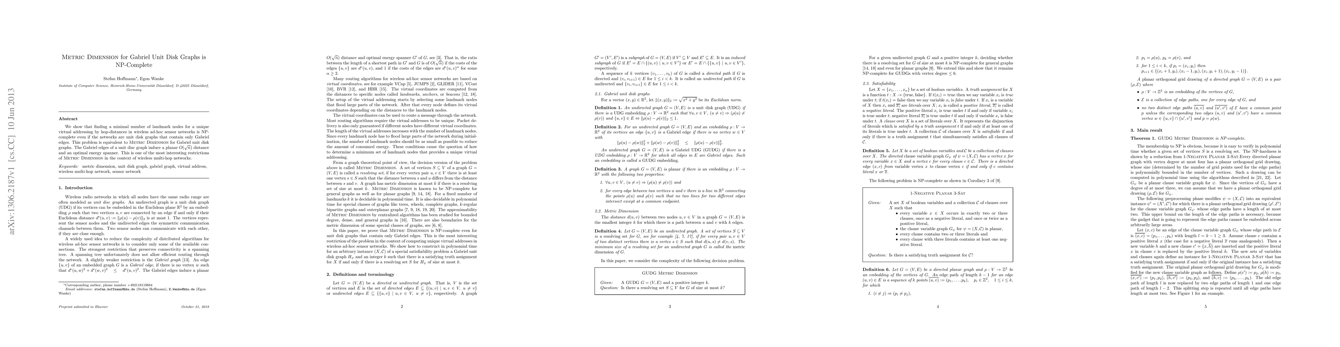 This paper demonstrates that determining the minimal number of landmark nodes for unique virtual addressing in Gabriel unit disk graphs is NP-complete, highlighting the complexity of the Metric Dimension problem even within the restricted context of wireless ad-hoc sensor networks. The Gabriel unit disk graph's unique edge structure provides interesting insights into network optimization.
