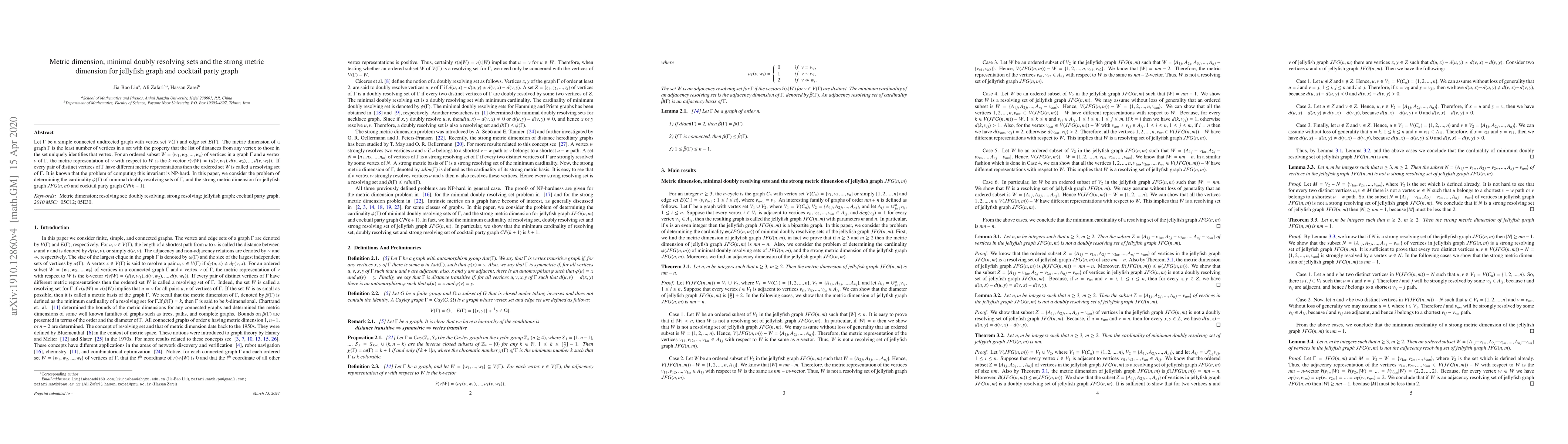 Let $\Gamma$ be a simple connected undirected graph with vertex set $V(\Gamma)$ and edge set $E(\Gamma)$. The metric dimension of a graph $\Gamma$ is the least number of vertices in a set with the property that the list of distances from any vertex to those in the set uniquely identifies that vertex. For an ordered subset $W = \{w_1, w_2, ..., w_k\}$ of vertices in a graph $\Gamma$ and a vertex $v$ of $\Gamma$, the metric representation of $v$ with respect to $W$ is the $k$-vector $r(v | W) = (d(v, w_1), d(v, w_2), ..., d(v, w_k ))$. If every pair of distinct vertices of $\Gamma$ have different metric representations then the ordered set $W$ is called a resolving set of $\Gamma$. It is known that the problem of computing this invariant is NP-hard. In this paper, we consider the problem of determining the cardinality $\psi(\Gamma)$ of minimal doubly resolving sets of $\Gamma$, and the strong metric dimension for jellyfish graph $JFG(n, m)$ and cocktail party graph $CP(k+1)$.